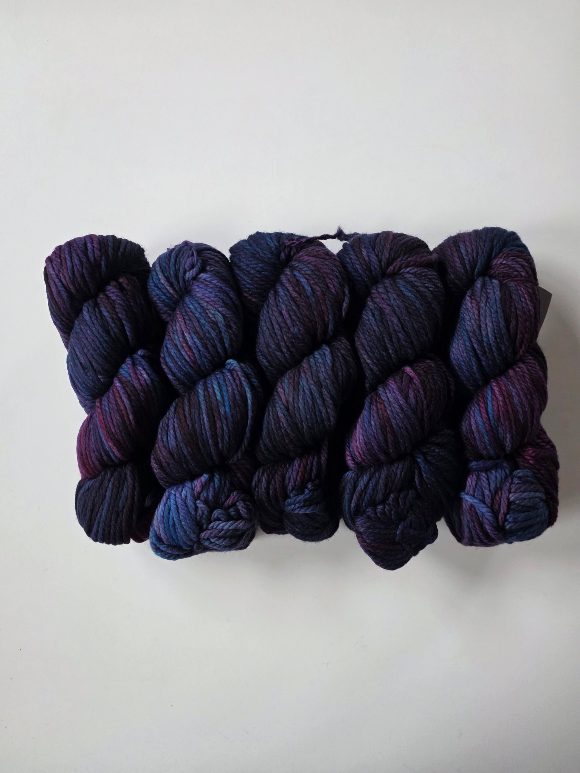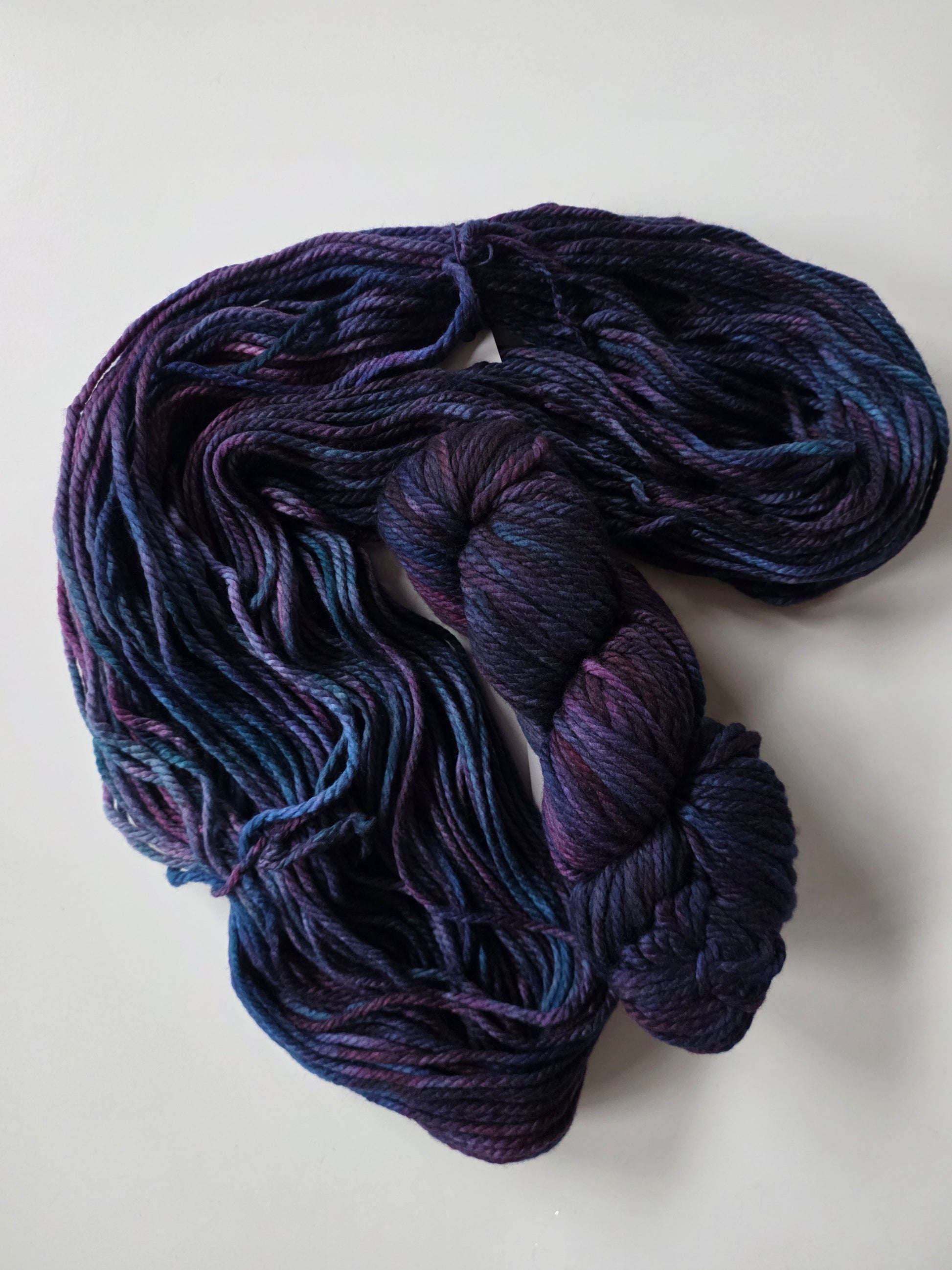 Malabrigo Chunky is 100% merino wool. 3 ply. Each skein is 104 yards of hand-dyed perfection, great for any knit or crochet creations, including accessories, garments, baby and kids items, housewares, toys, cables, textured stitches, color-work.