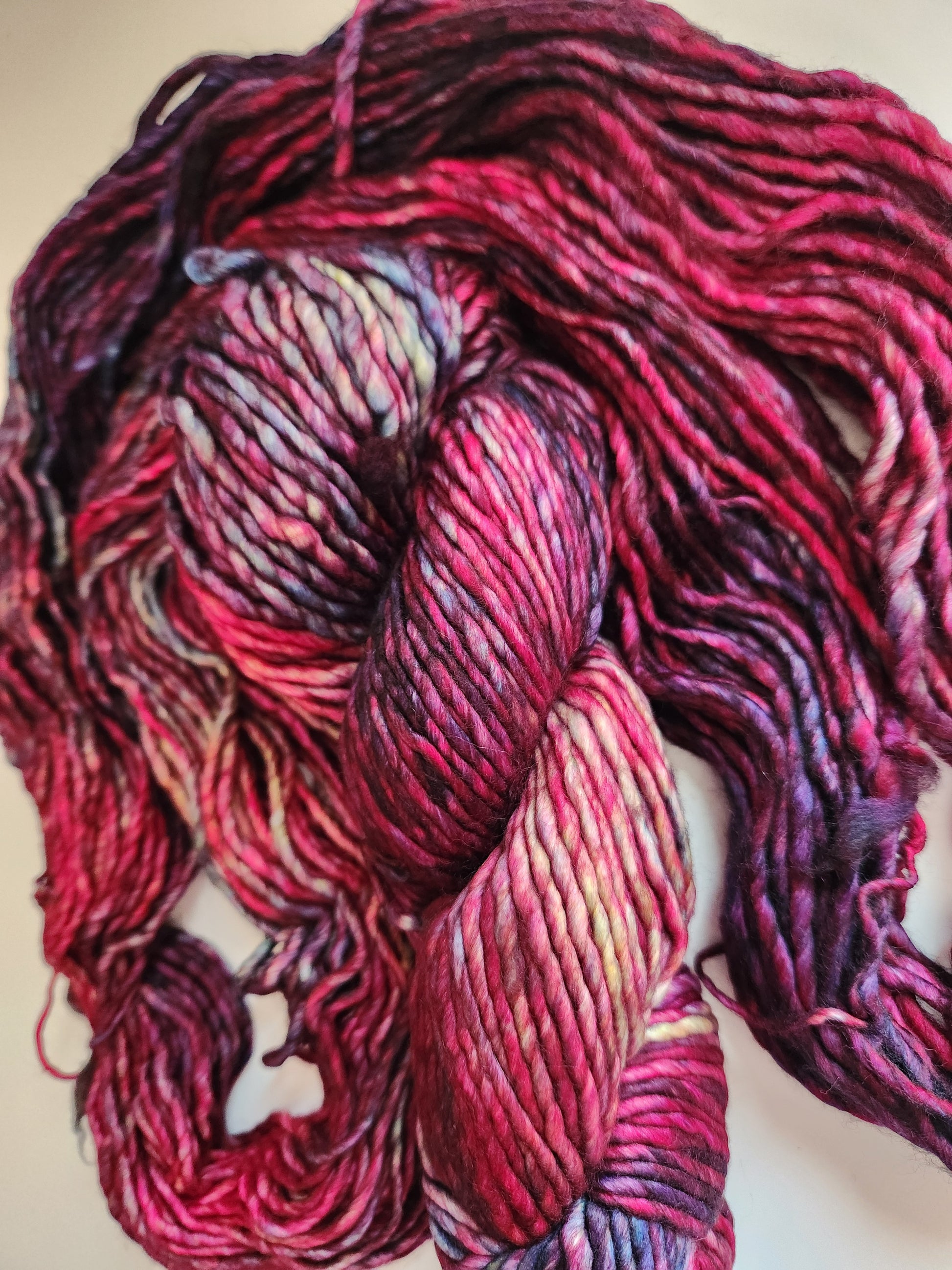 Malabrigo Noventa 100% superwash merino wool. Single ply twist. Each skein is 90 yards of incredibly cozy hand dyed yarn. Great for quick knits, textured stitches, hats, cowls, scarves, outerwear.