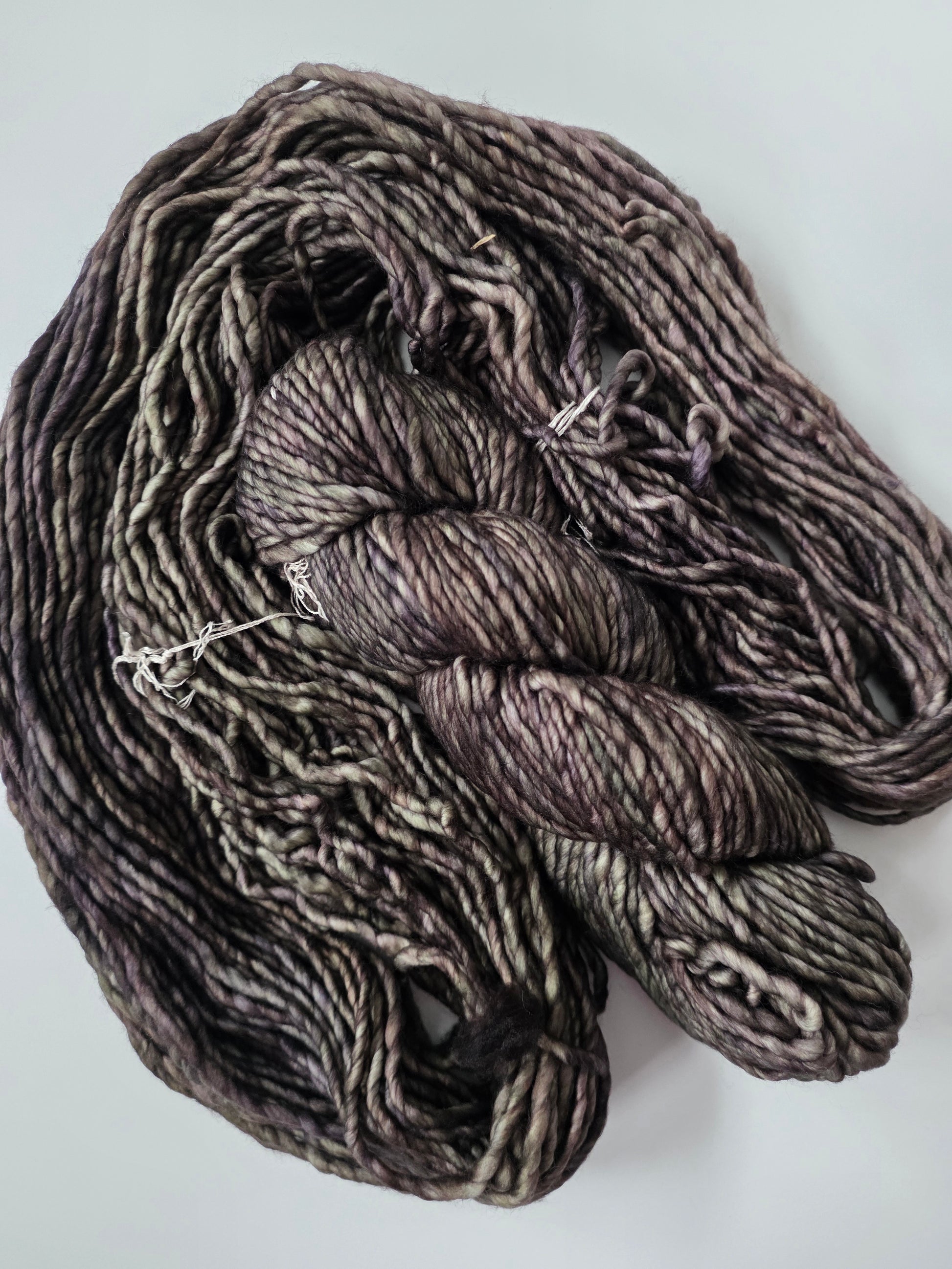 This yarn can be used with a variety of the patterns on my website, but looks especially great with the Gales of November Bulky , Birch Leaves or North Road Bulky patterns. This yarn is perfect for the Sugar Loaf Shawl or Shovel Point Shawl.