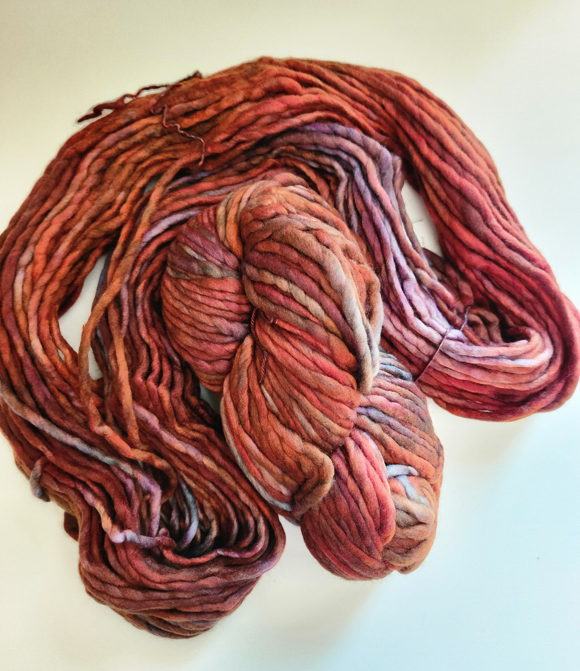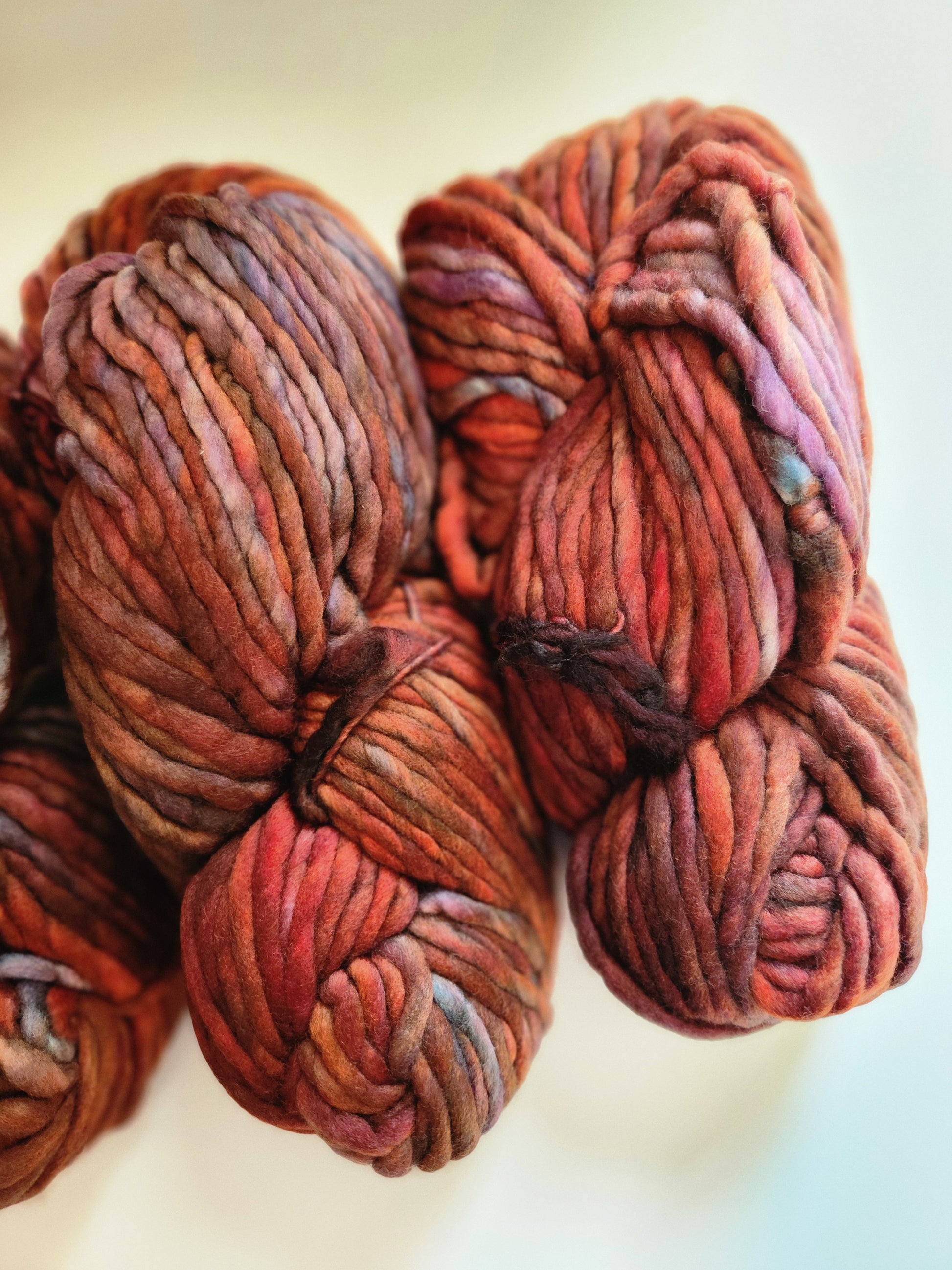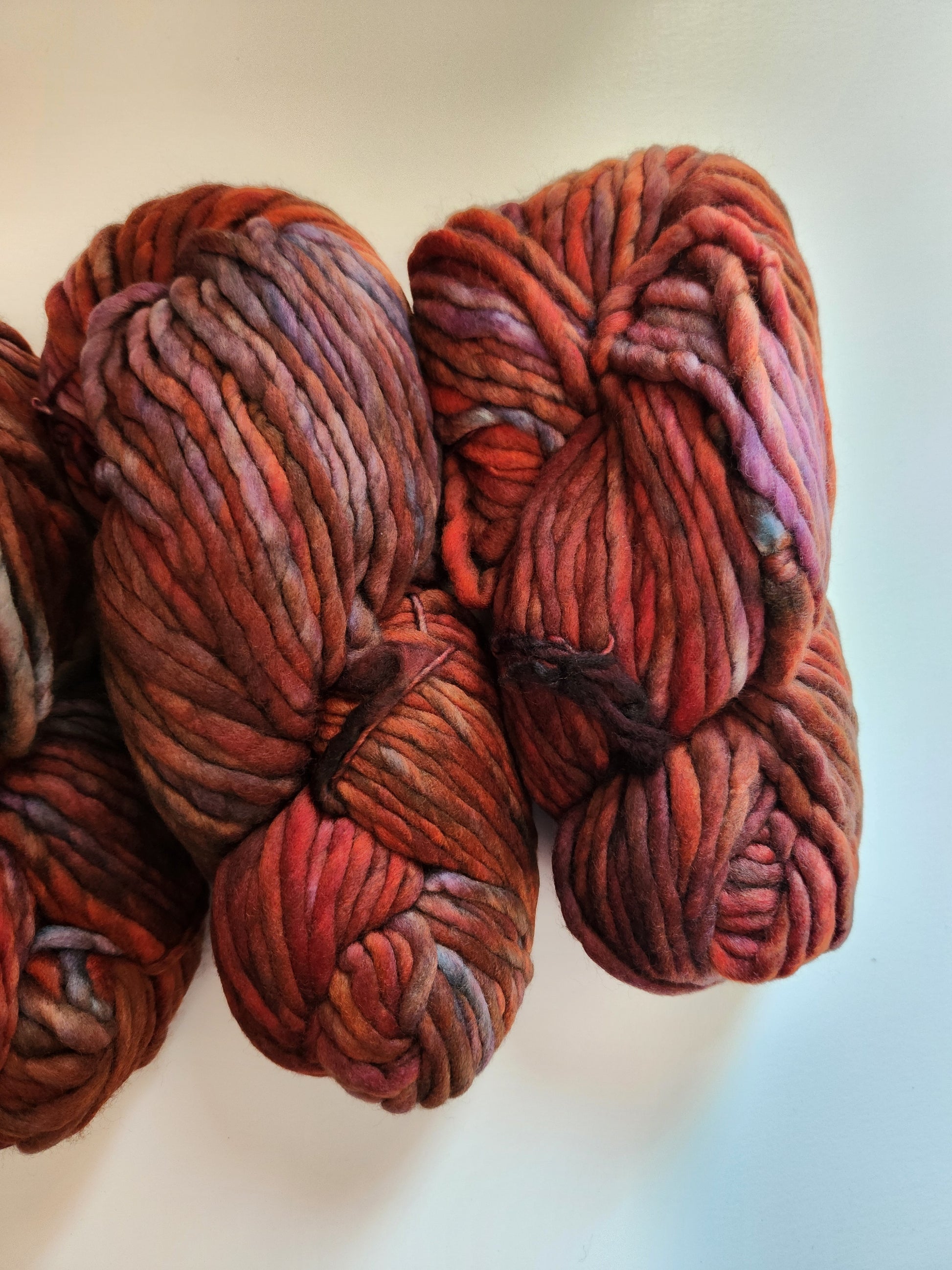 Malabrigo Rasta 100% merino wool. Single ply slightly felted with a twist. Each skein is 90 yards of incredibly cozy hand dyed yarn. Great for quick knits, textured stitches, hats, cowls, scarves, outerwear.