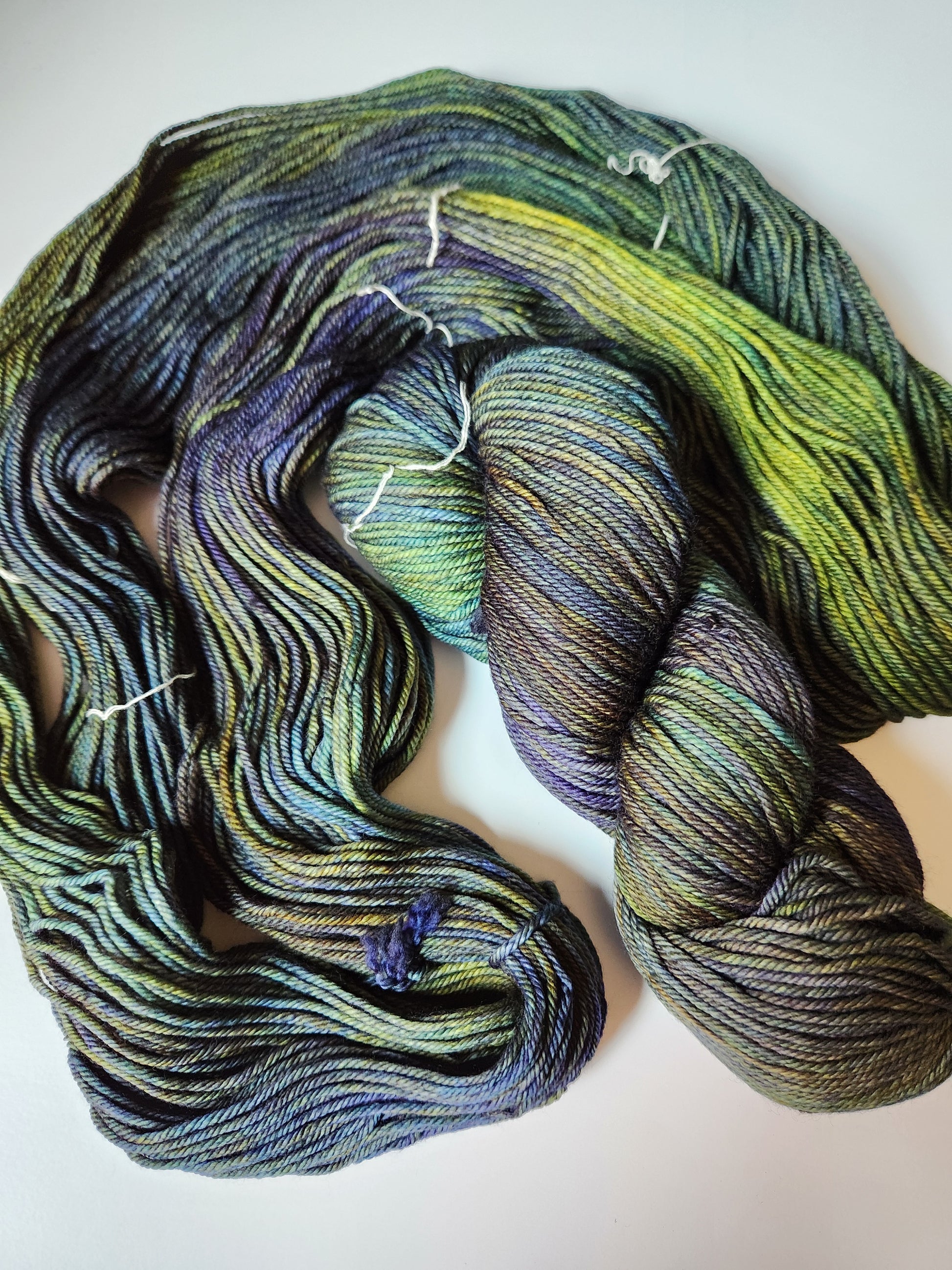 Malabrigo Rios 100% superwash merino wool. 4 ply. Each skein is 210 yards of hand-dyed perfection, great for any knit or crochet creations, including accessories, garments, baby and kids items, housewares, toys, cables, textured stitches, color-work.