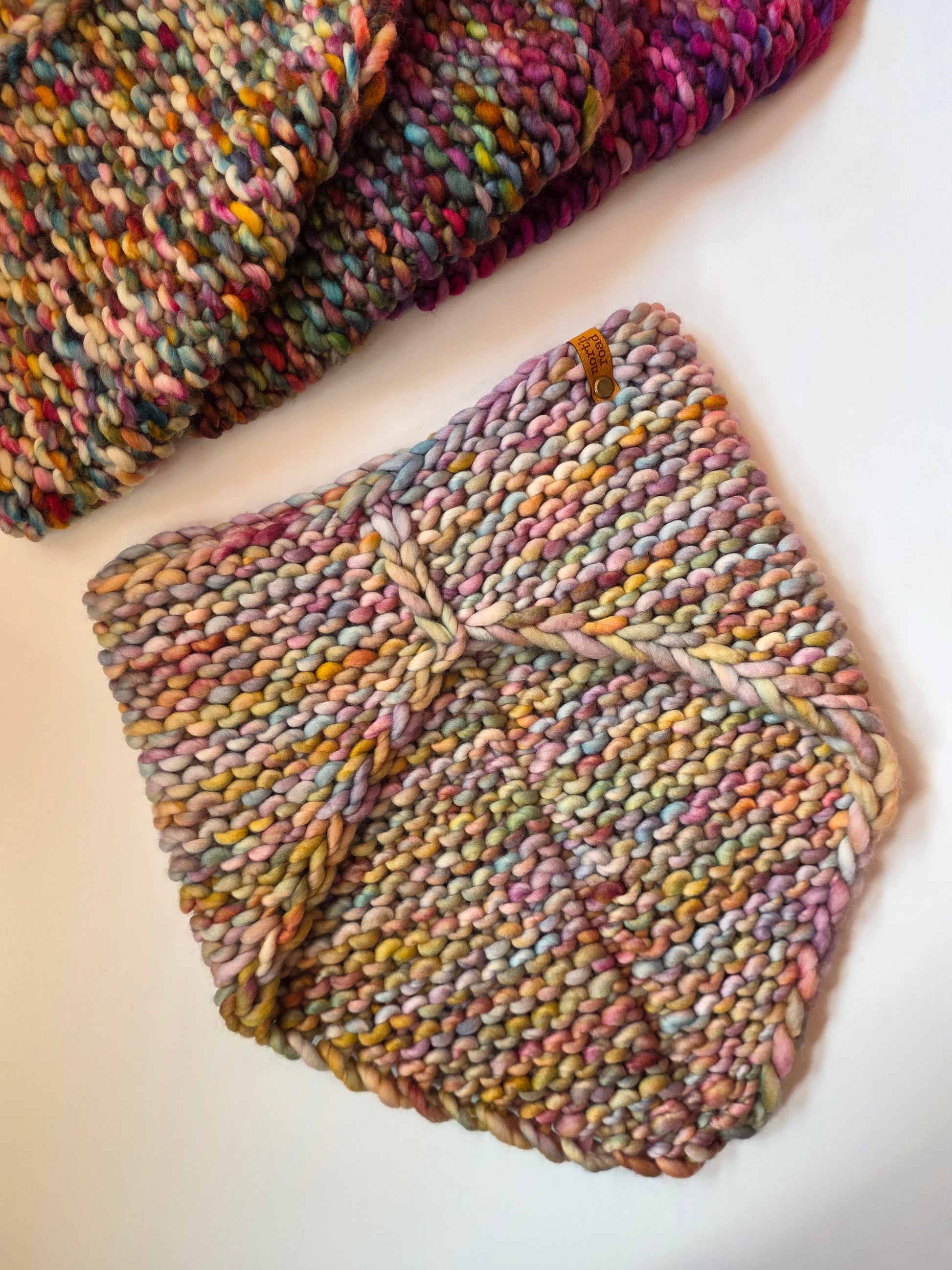 This bandana cowl was hand knit by me in my northeast Minnesota home.