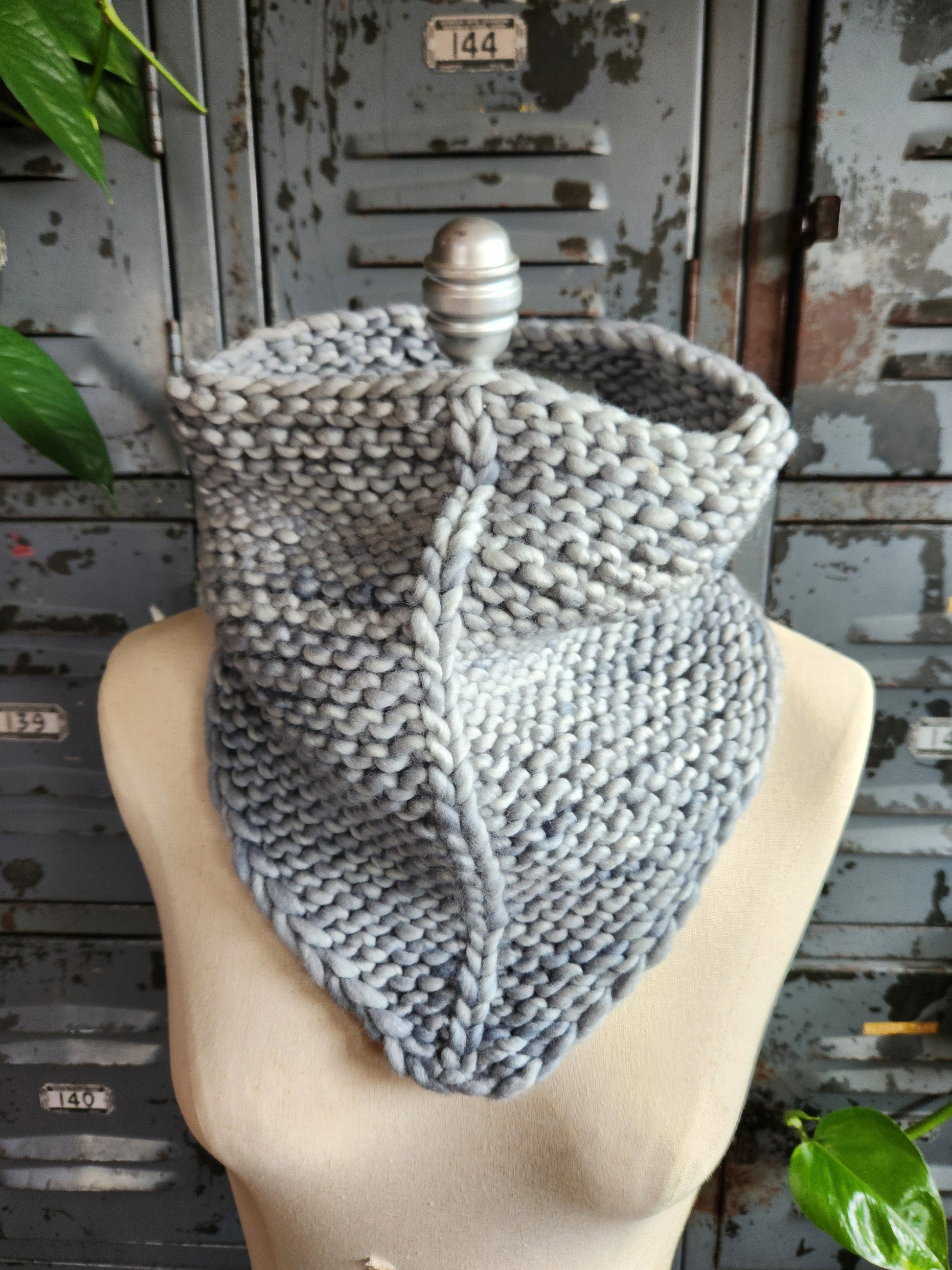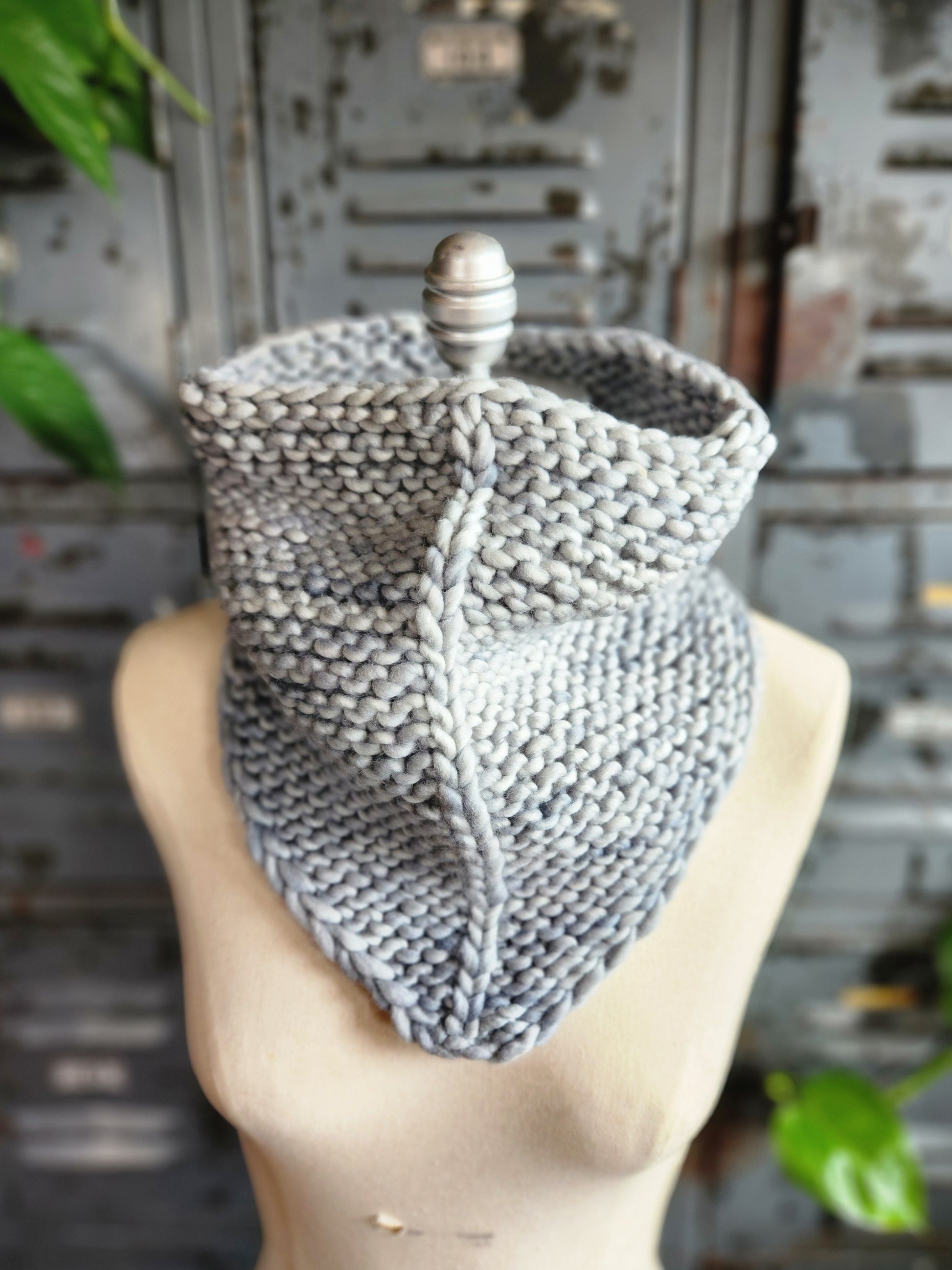 This bandana cowl was hand knit by me in my northeast Minnesota home.