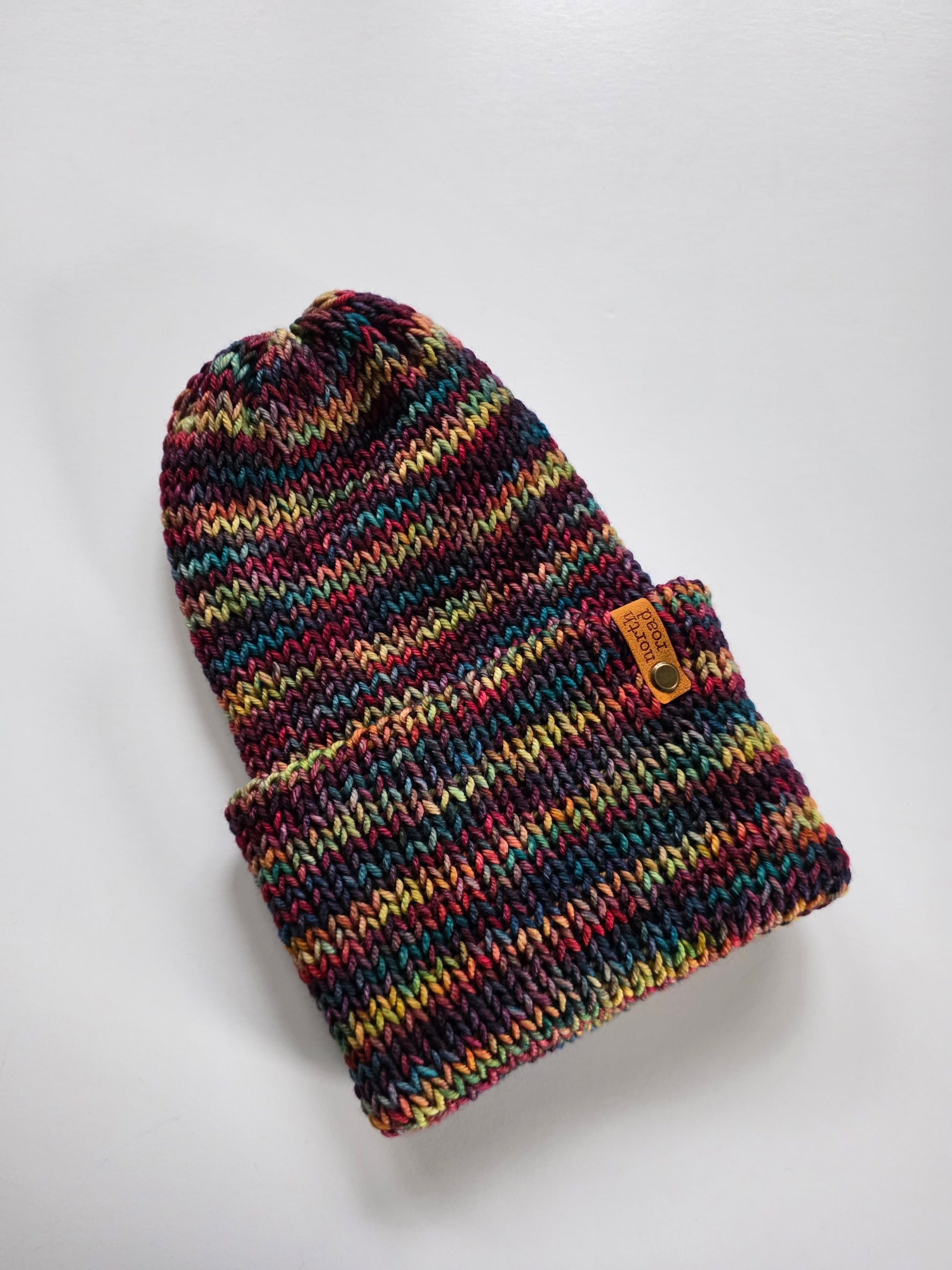 The hat is made from a beautiful 100% merino wool yarn that is sustainably and ethically sourced, and hand dyed. Fits most average adult heads. Shown here on a glass mannequin head that measures 22" in circumference.