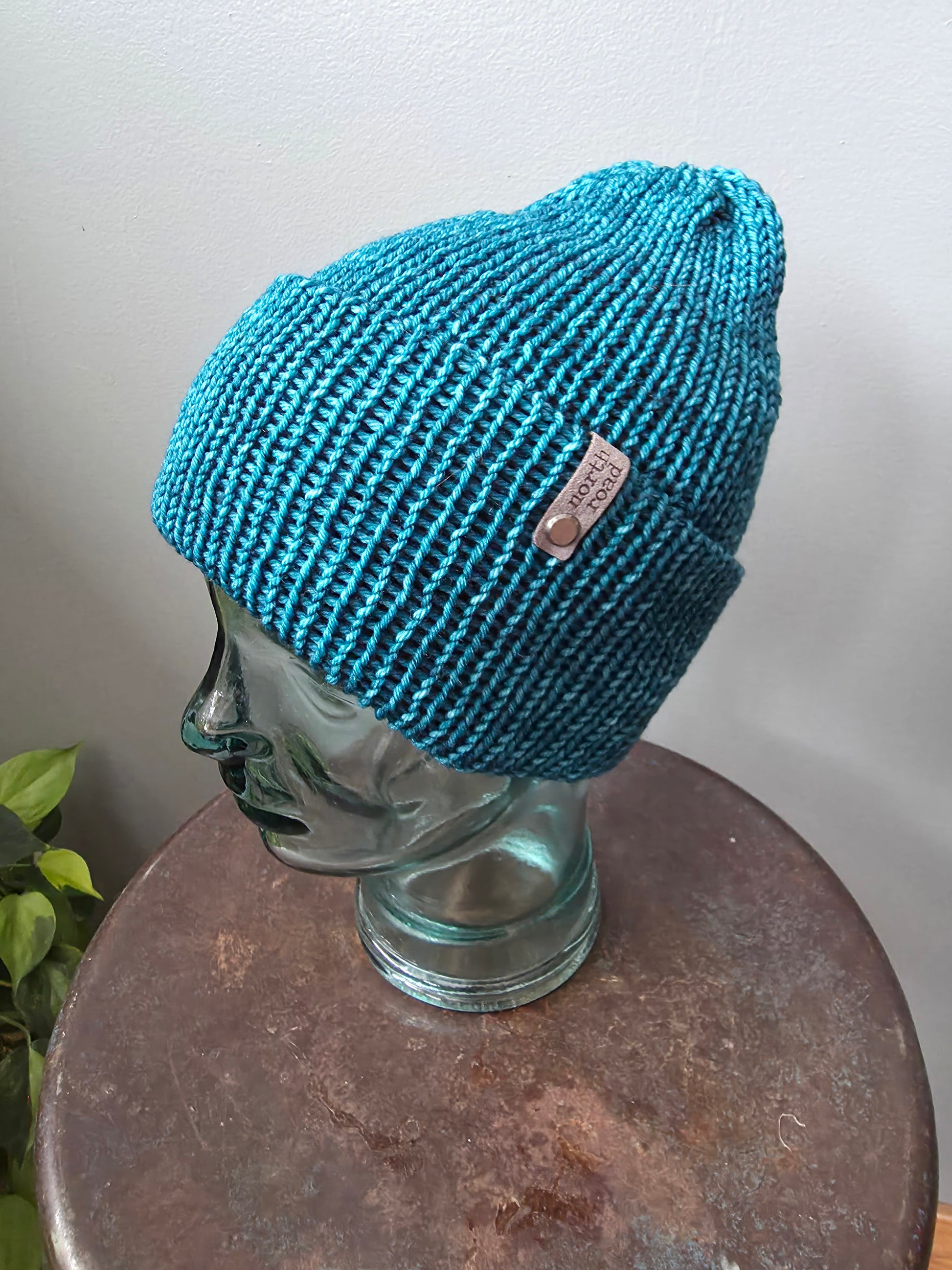 The hat is made from a beautiful 100% merino wool yarn that is sustainably and ethically sourced, and hand dyed. Fits most average adult heads. Shown here on a glass mannequin head that measures 22" in circumference.