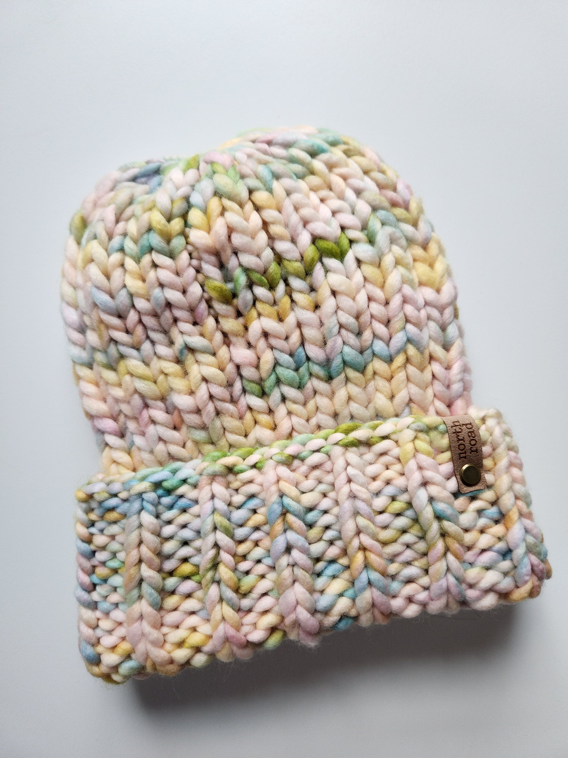 This hat was hand knit by me in my northeast Minnesota home.