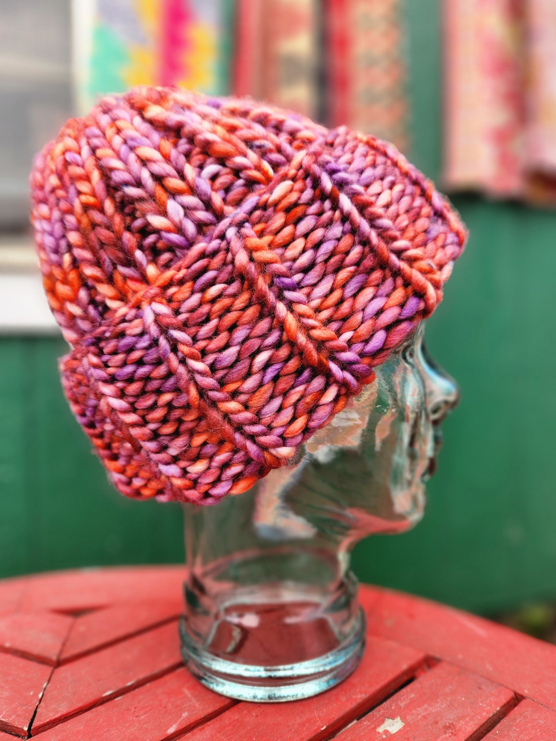 The hat is made from a beautiful merino wool yarn that is sustainably and ethically sourced. Fits most average adult heads. Shown here on a glass mannequin head that measures 22" in circumference.