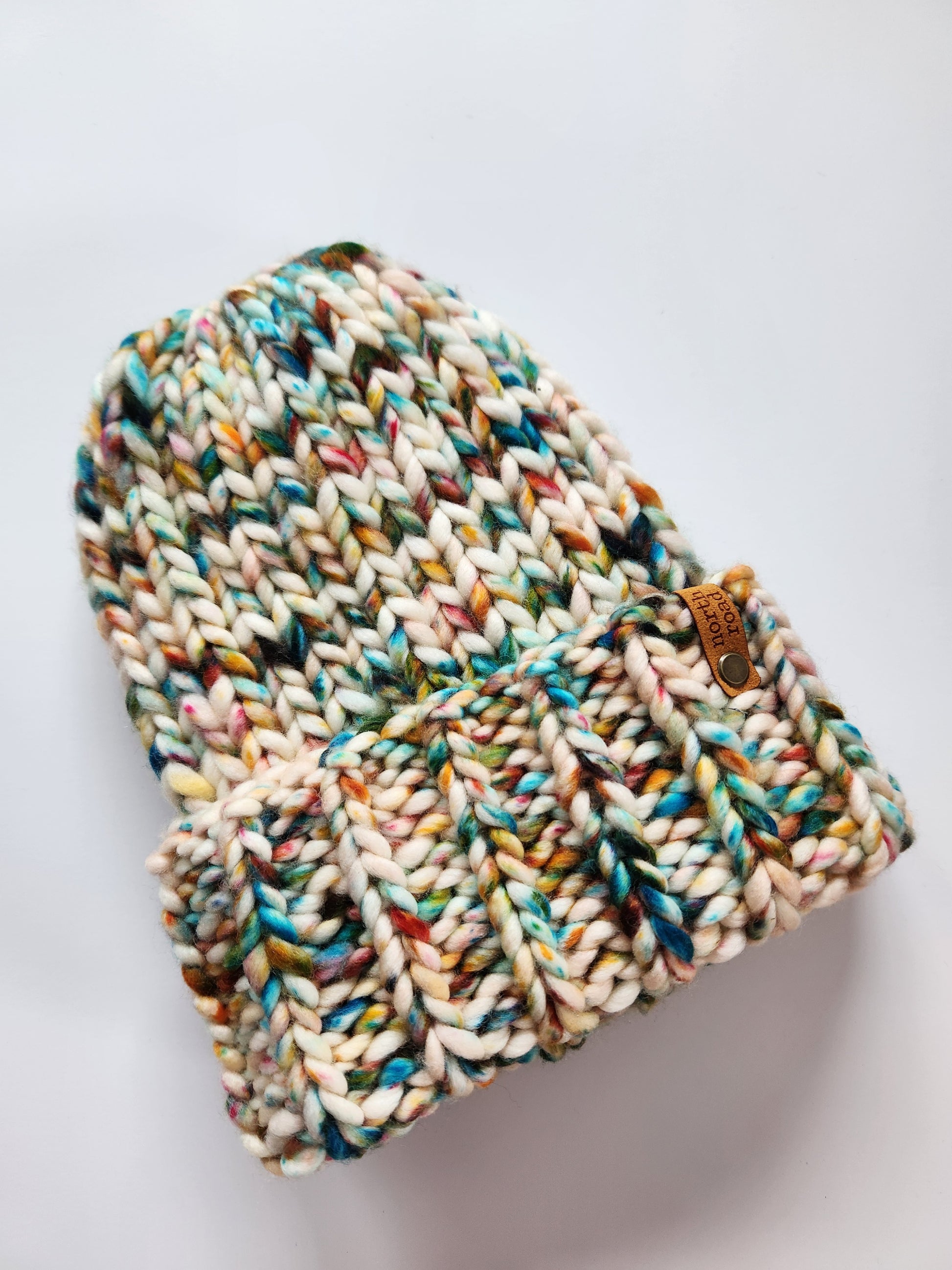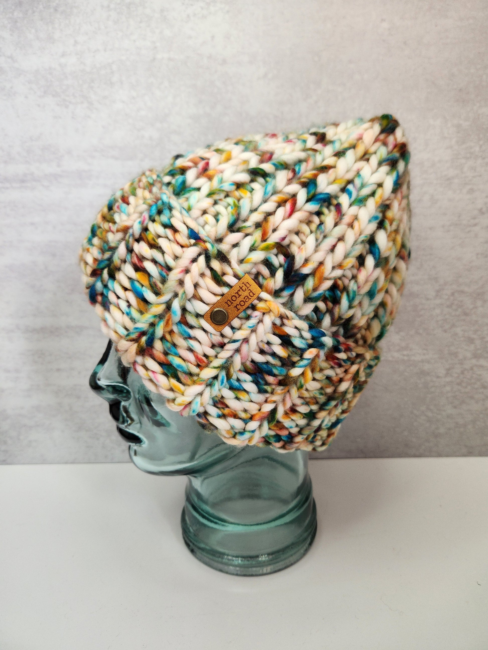 The hat is made from a beautiful merino wool yarn that is sustainably and ethically sourced and hand dyed. Fits most average adult heads. Shown here on a glass mannequin head that measures 22" in circumference.