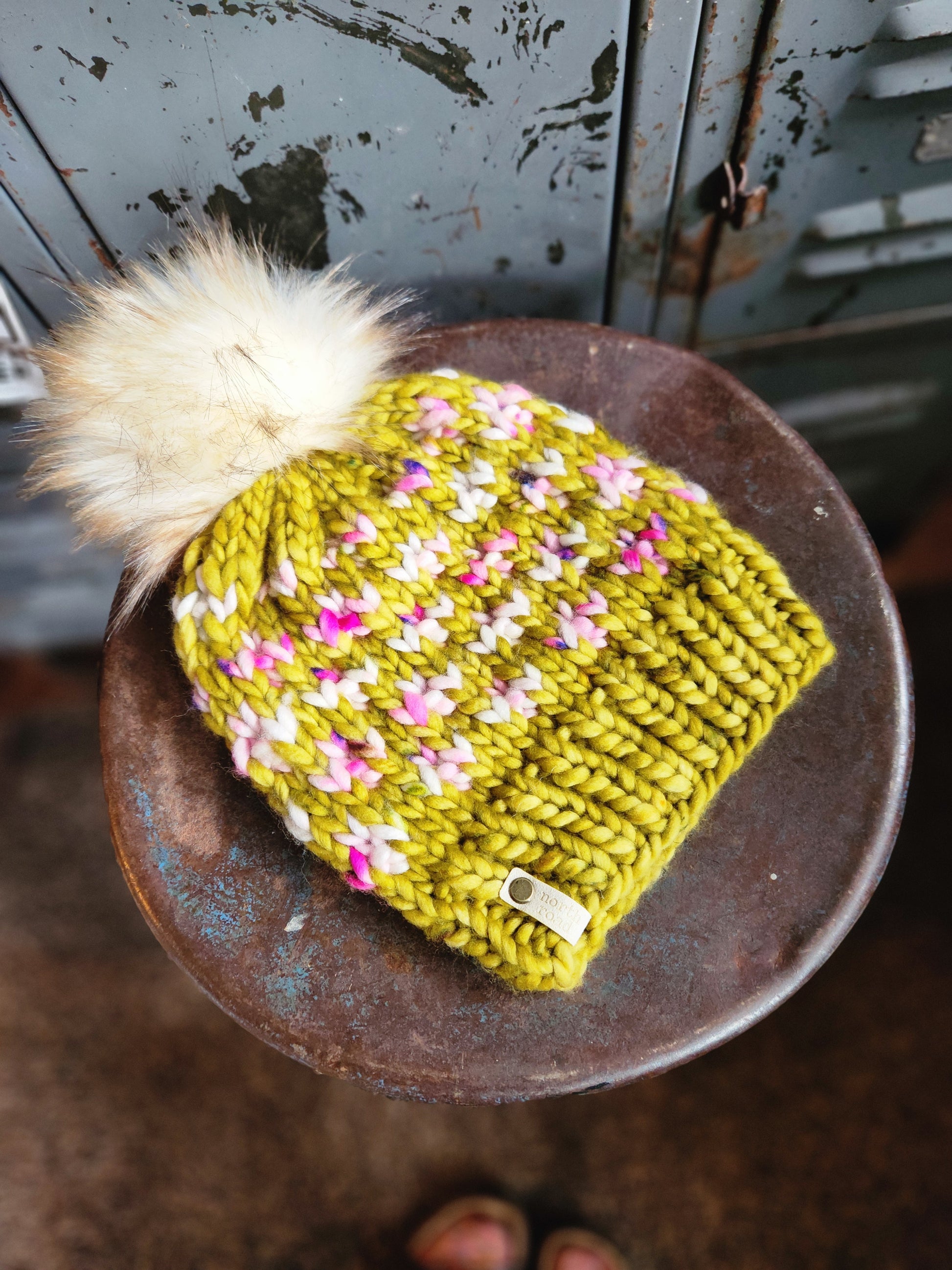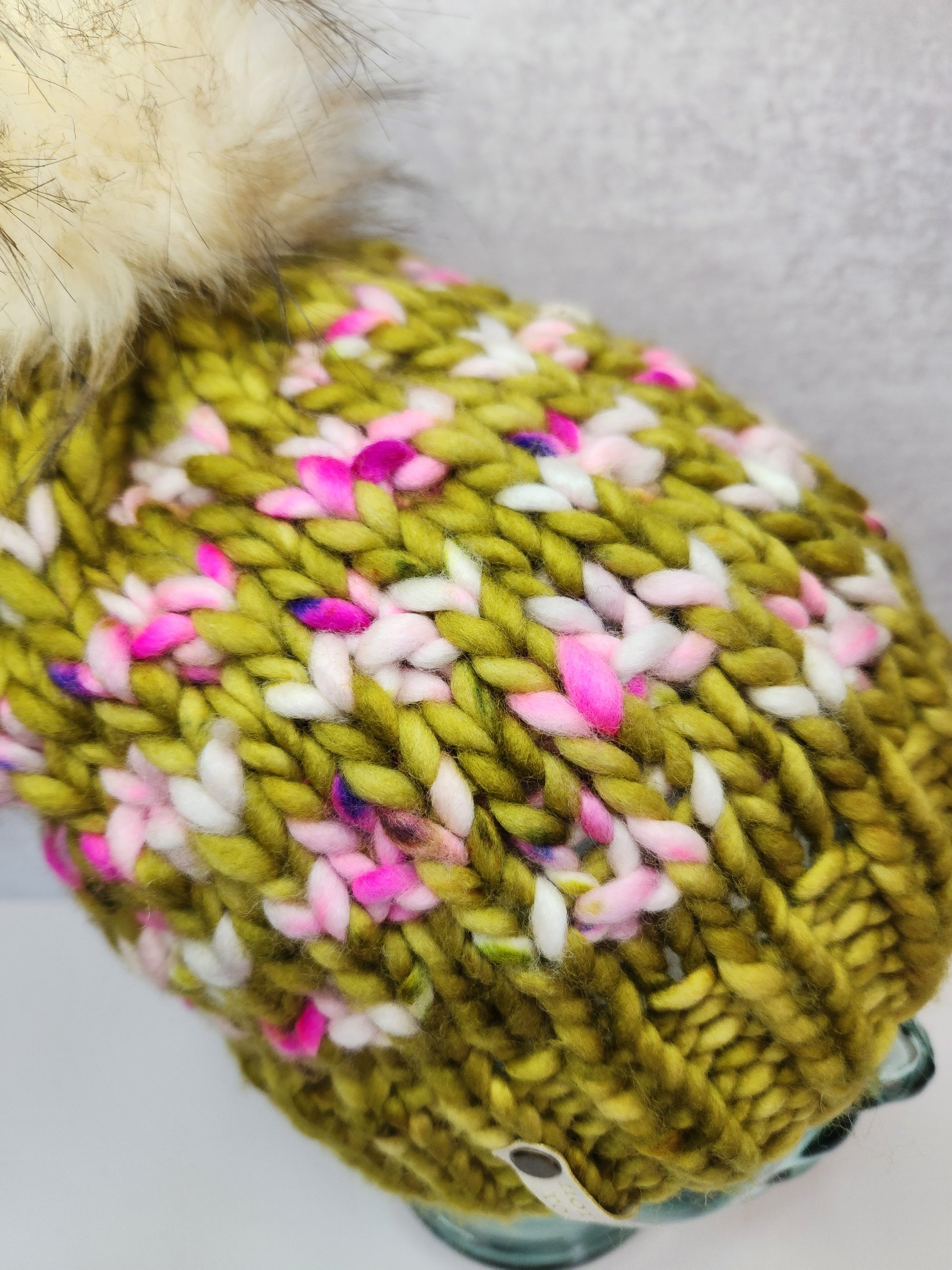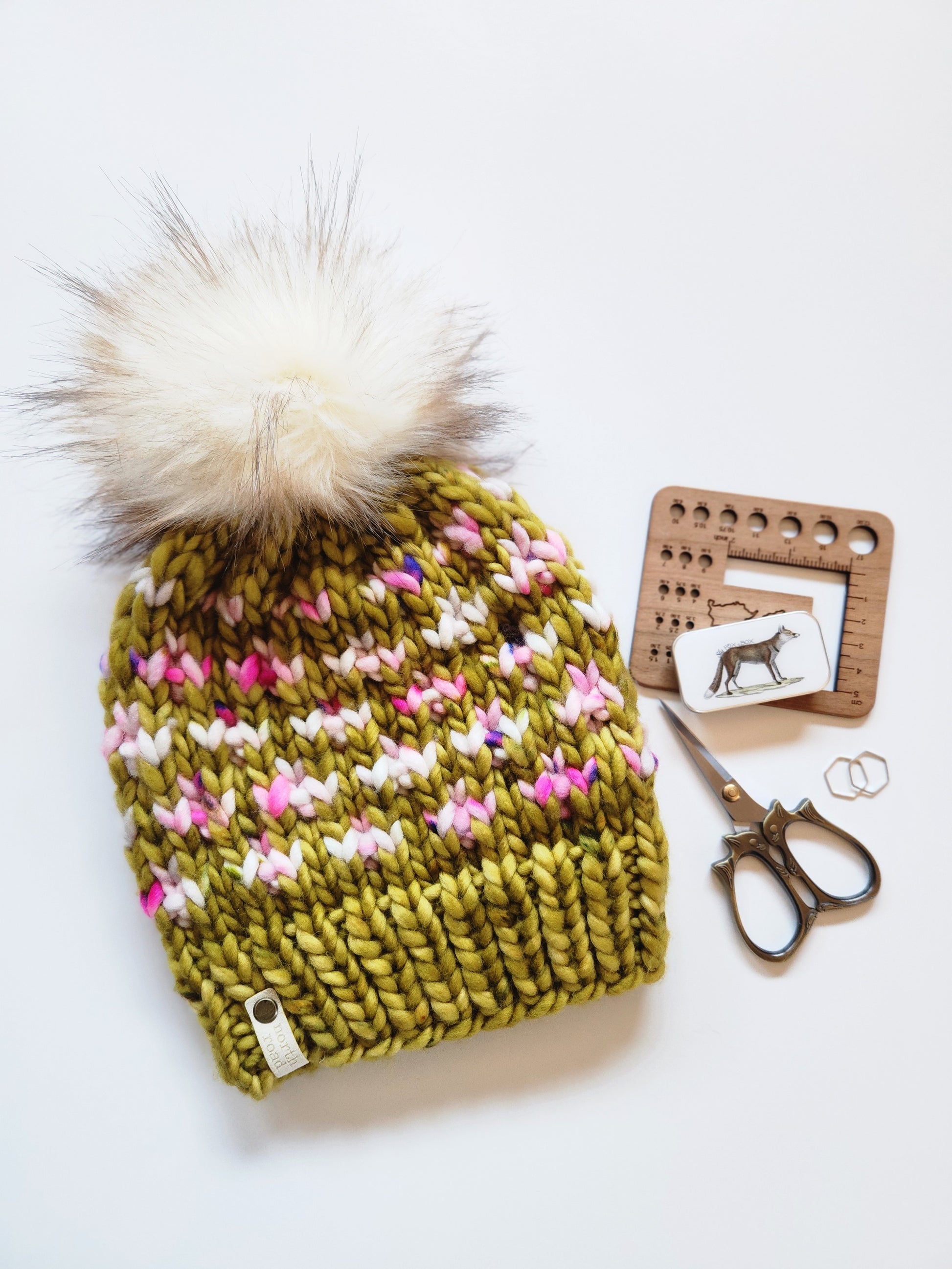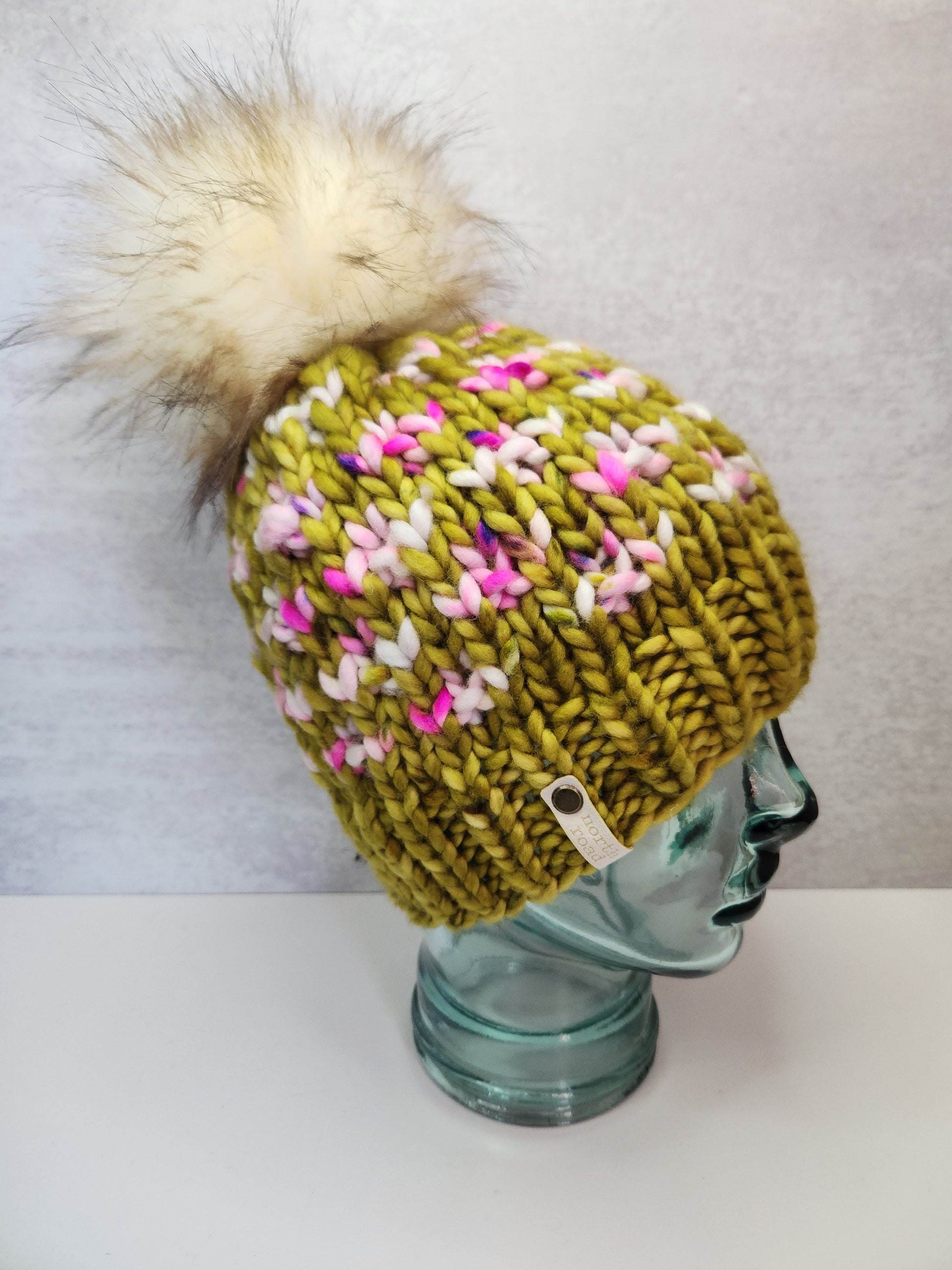 The hat is made from a beautiful 100% merino wool yarn that is sustainably and ethically sourced, and hand dyed. Fits most average adult heads. Shown here on a glass mannequin head that measures 22" in circumference.