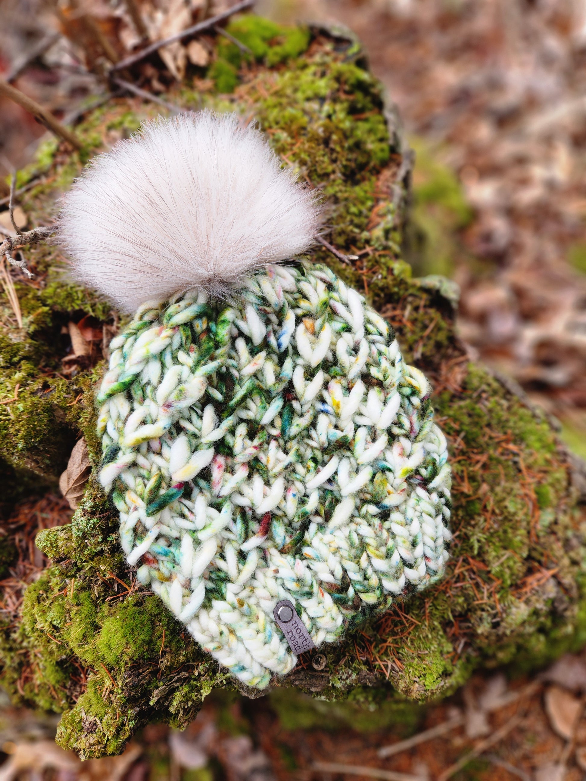 Genuine suede tag with metal rivet. Handmade faux fur pom.