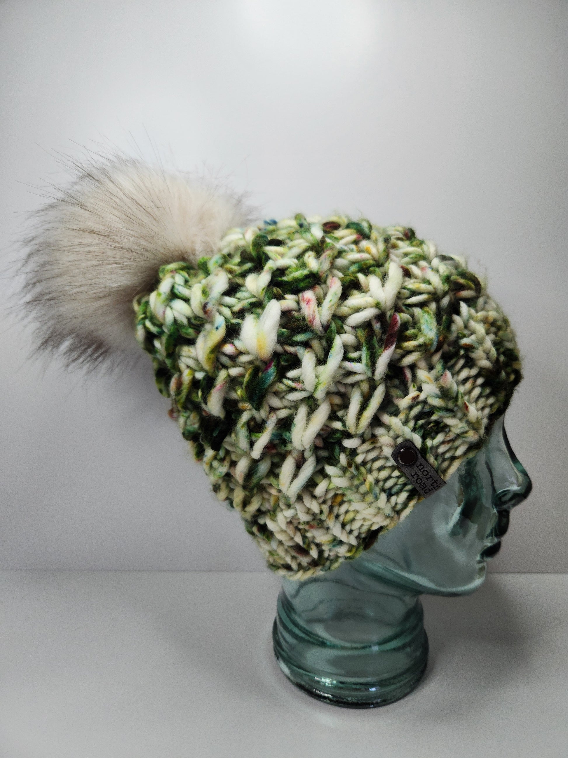 The hat is made from a beautiful 100% merino wool yarn that is sustainably and ethically sourced, and hand dyed. Fits most average adult heads. Shown here on a glass mannequin head that measures 22" in circumference.