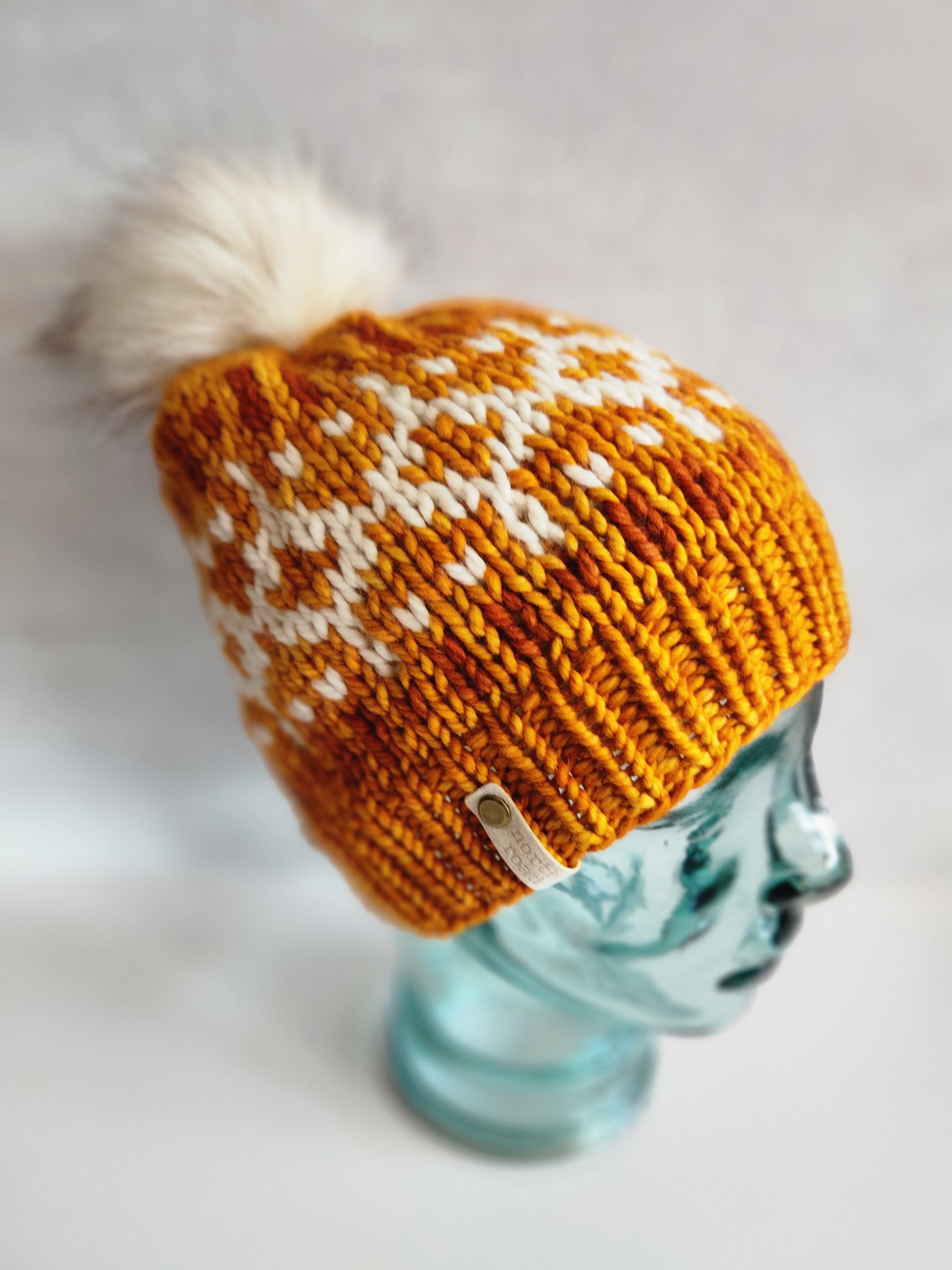 The hat is made from a beautiful 100% merino wool yarn that is sustainably and ethically sourced, and hand dyed. Fits most average adult heads. Shown here on a glass mannequin head that measures 22" in circumference.