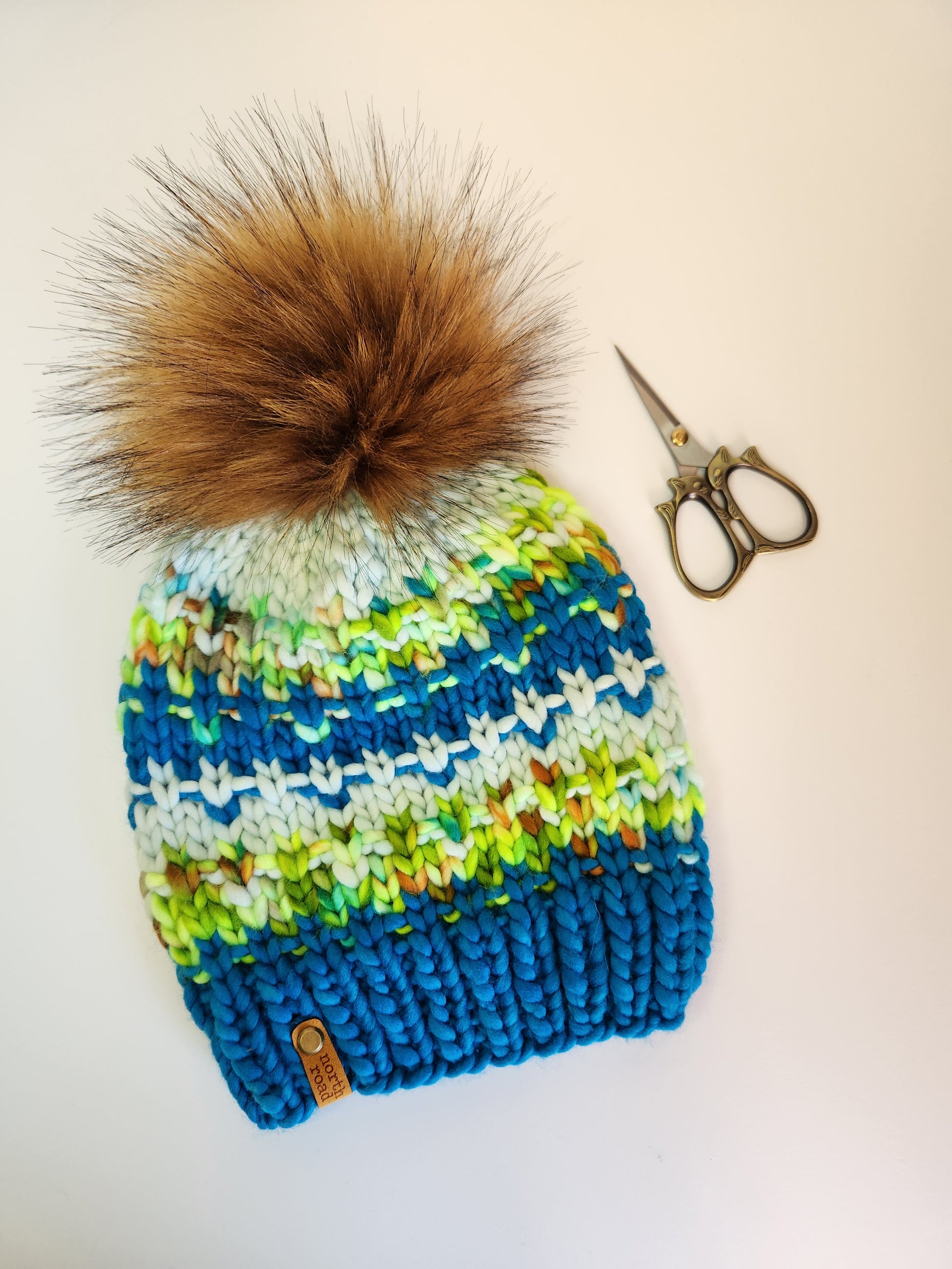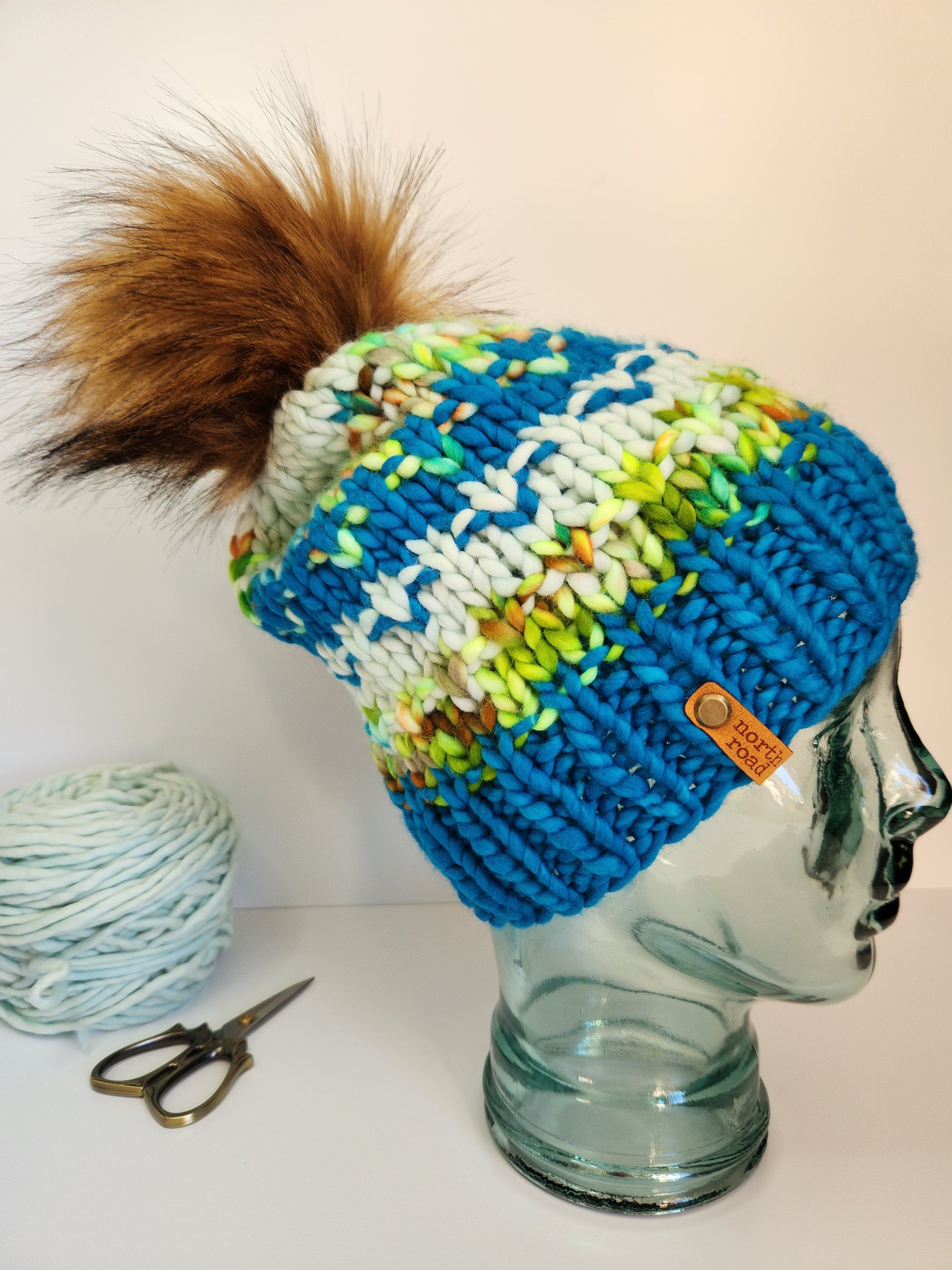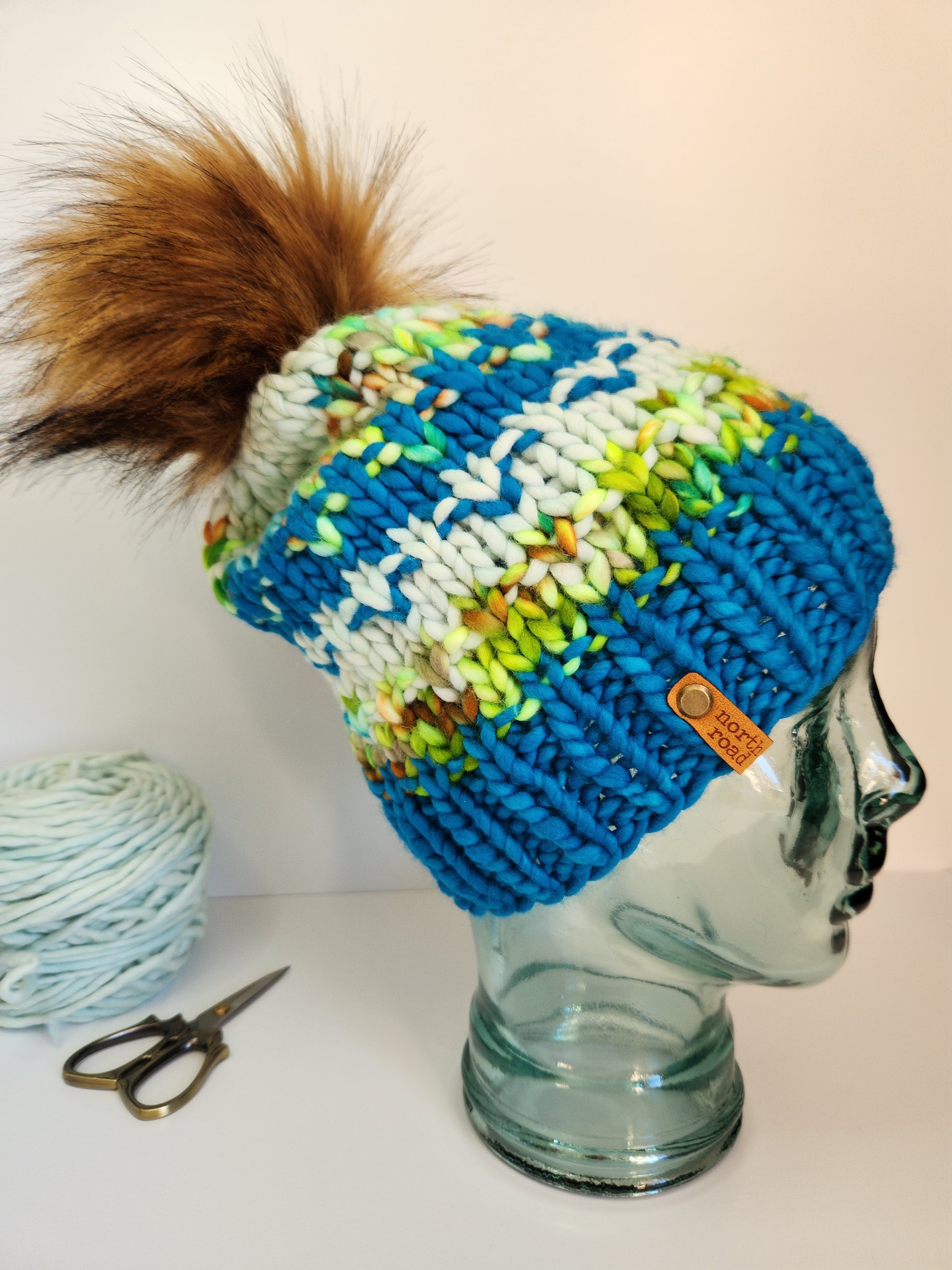 The hat is made from a beautiful 100% merino wool yarn that is sustainably and ethically sourced, and hand dyed. Fits most average adult heads. Shown here on a glass mannequin head that measures 22" in circumference.