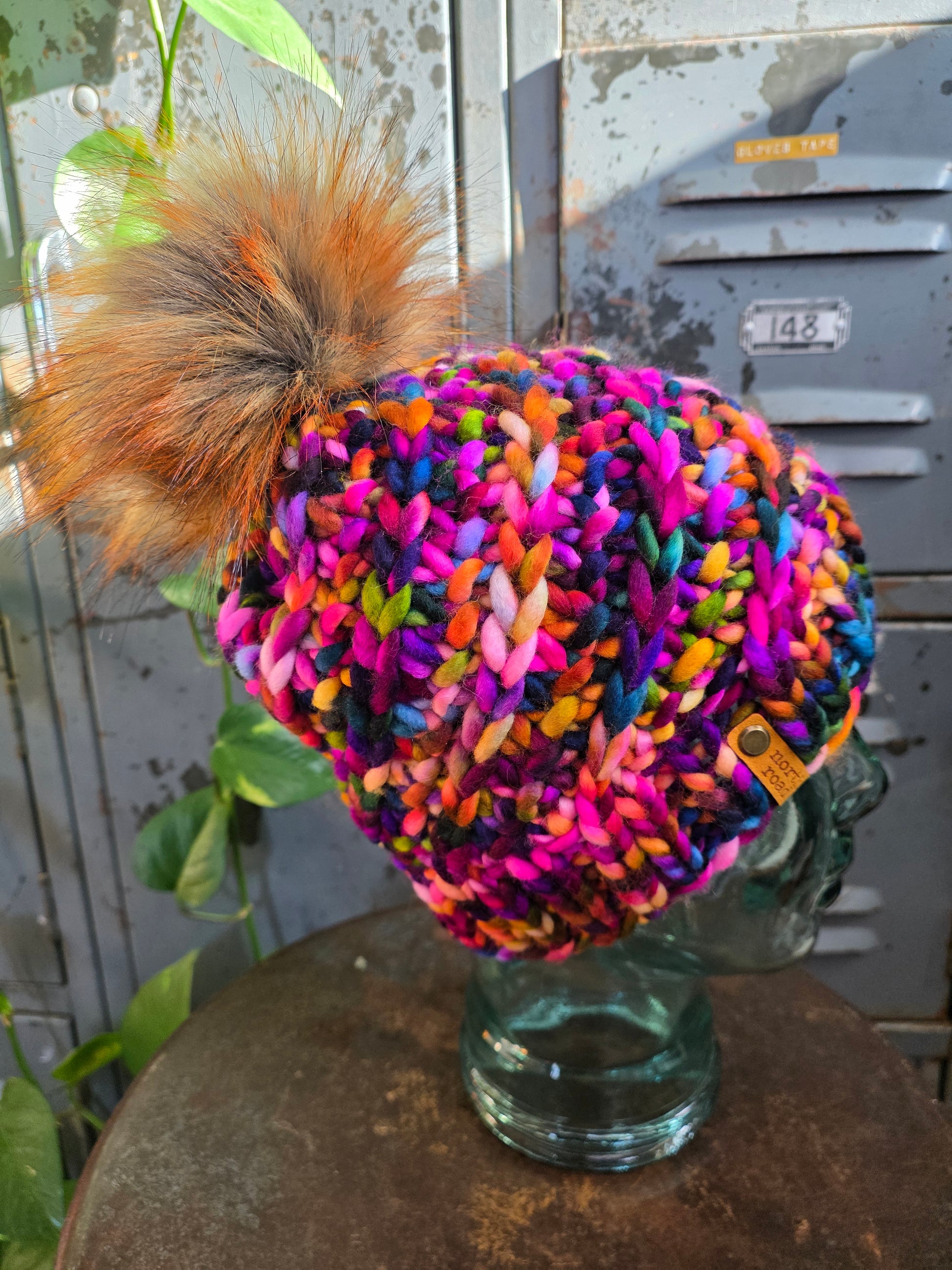 Genuine suede tag with metal rivet. Handmade faux fur pom.