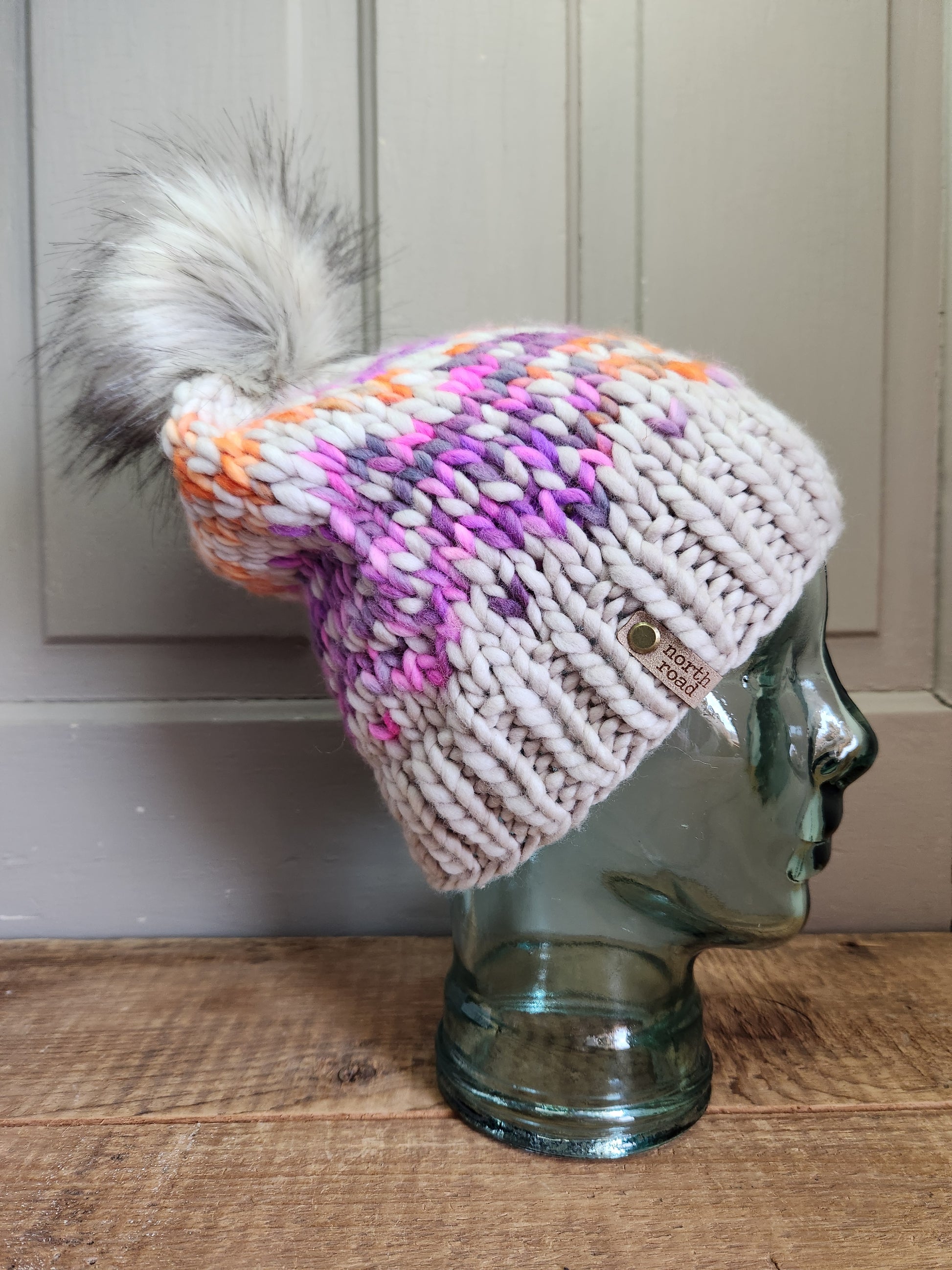 The hat is made from a beautiful 100% merino wool yarn that is sustainably and ethically sourced, and hand dyed. Fits most average adult heads. Shown here on a glass mannequin head that measures 22" in circumference.