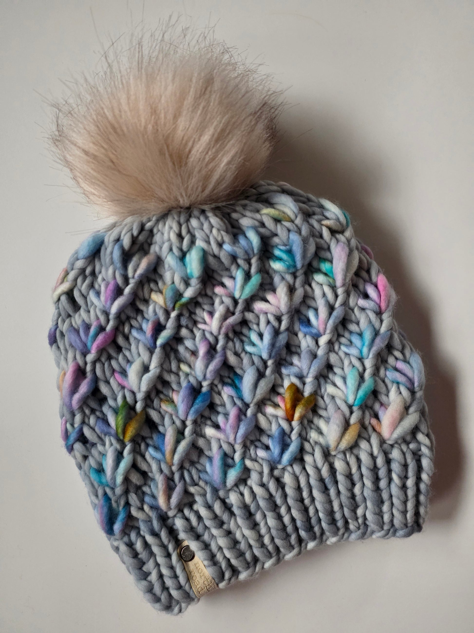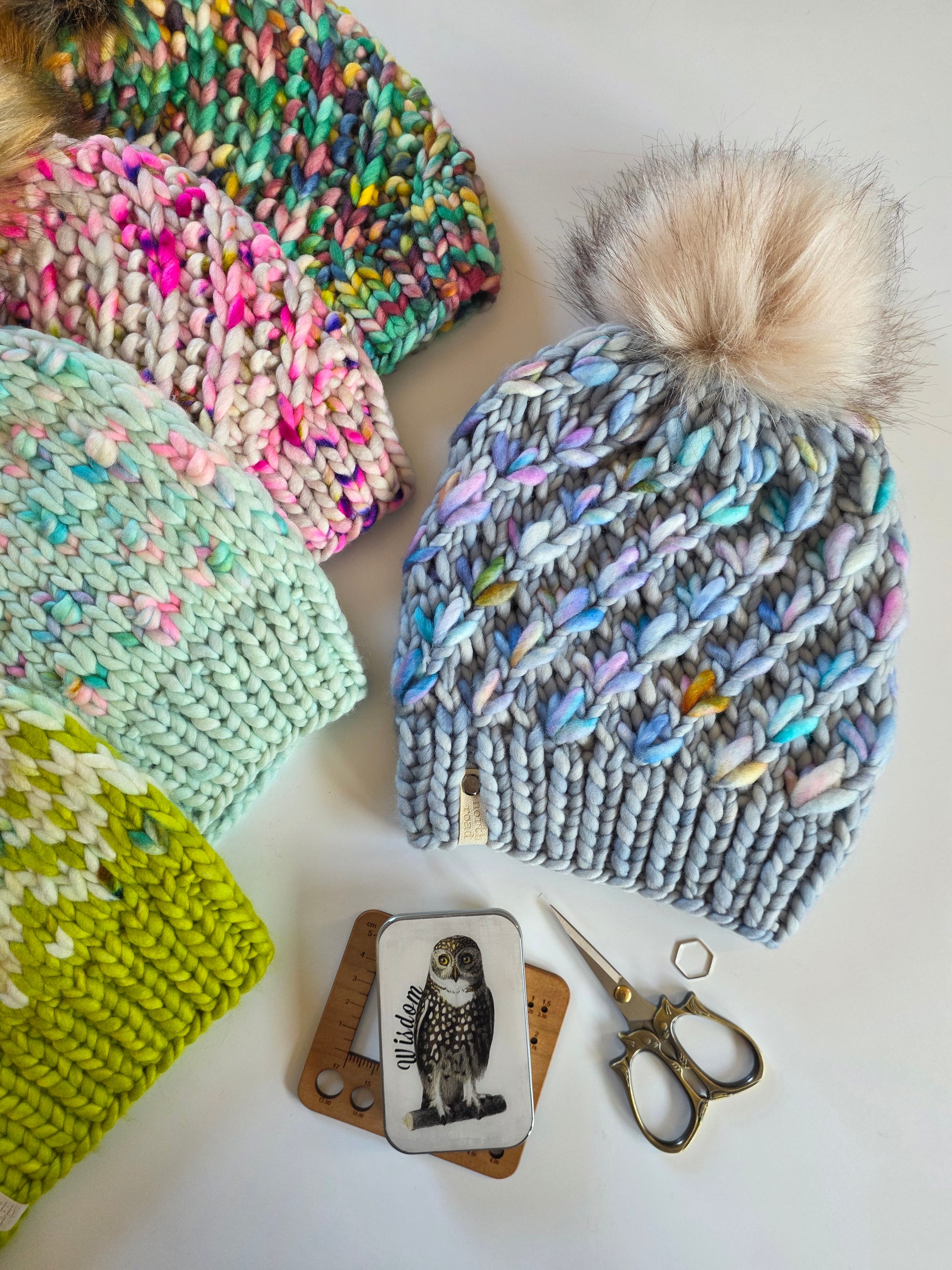 The hat is made from a beautiful 100% merino wool yarn that is sustainably and ethically sourced, and hand dyed. Fits most average adult heads. Shown here on a glass mannequin head that measures 22" in circumference.