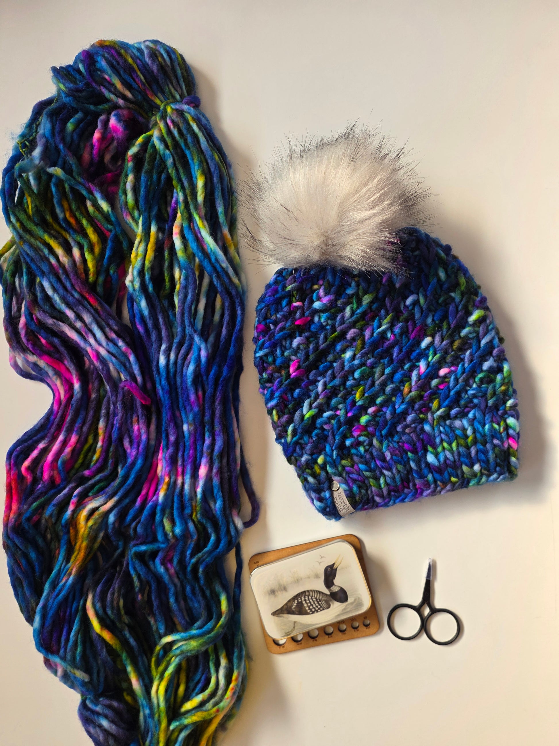 The hat is made from a beautiful 100% merino wool yarn that is sustainably and ethically sourced, and hand dyed. Fits most average adult heads. Shown here on a glass mannequin head that measures 22" in circumference.