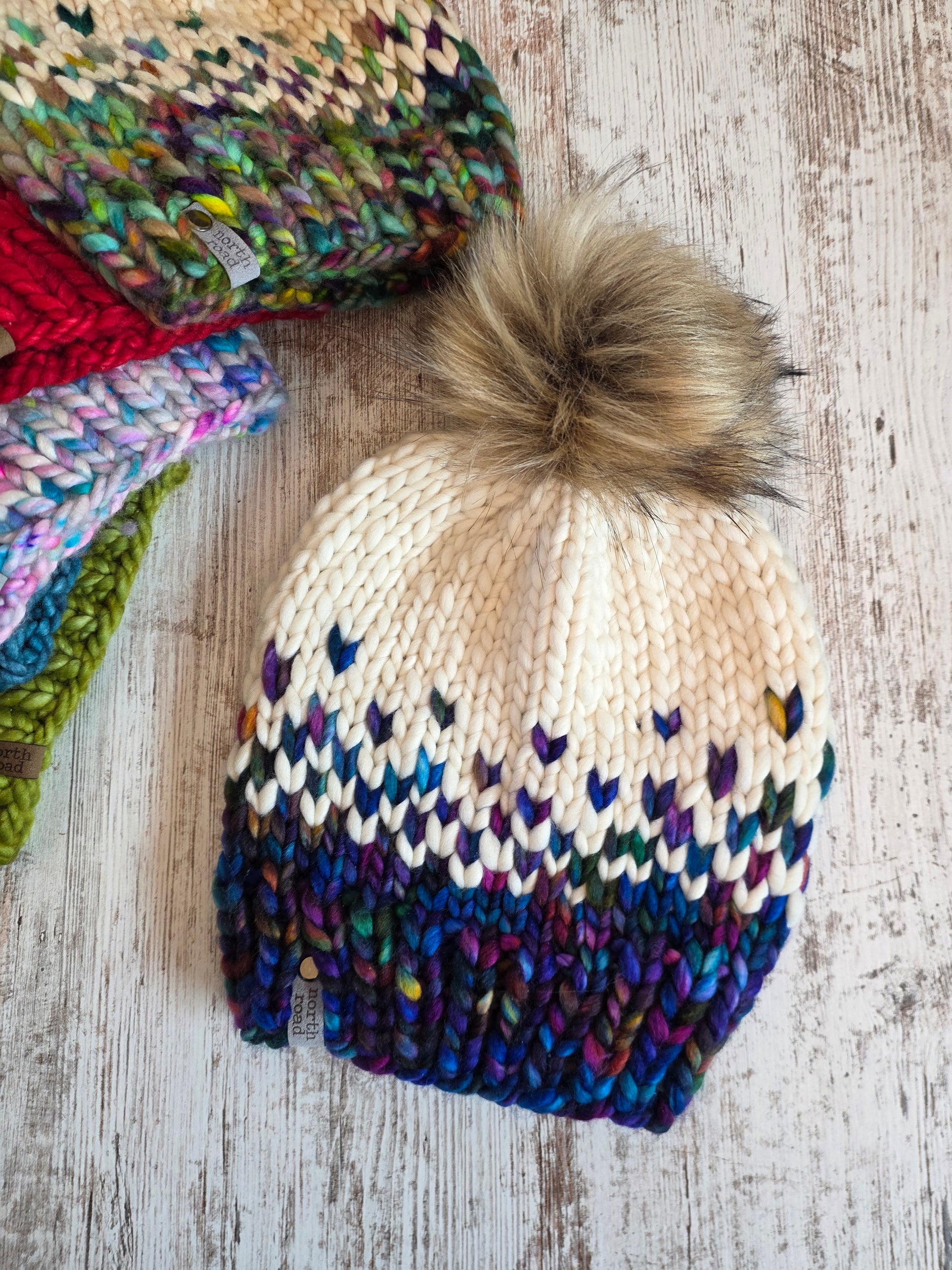 The hat is made from a beautiful 100% merino wool yarn that is sustainably and ethically sourced, and hand dyed. Fits most average adult heads. Shown here on a glass mannequin head that measures 22" in circumference.