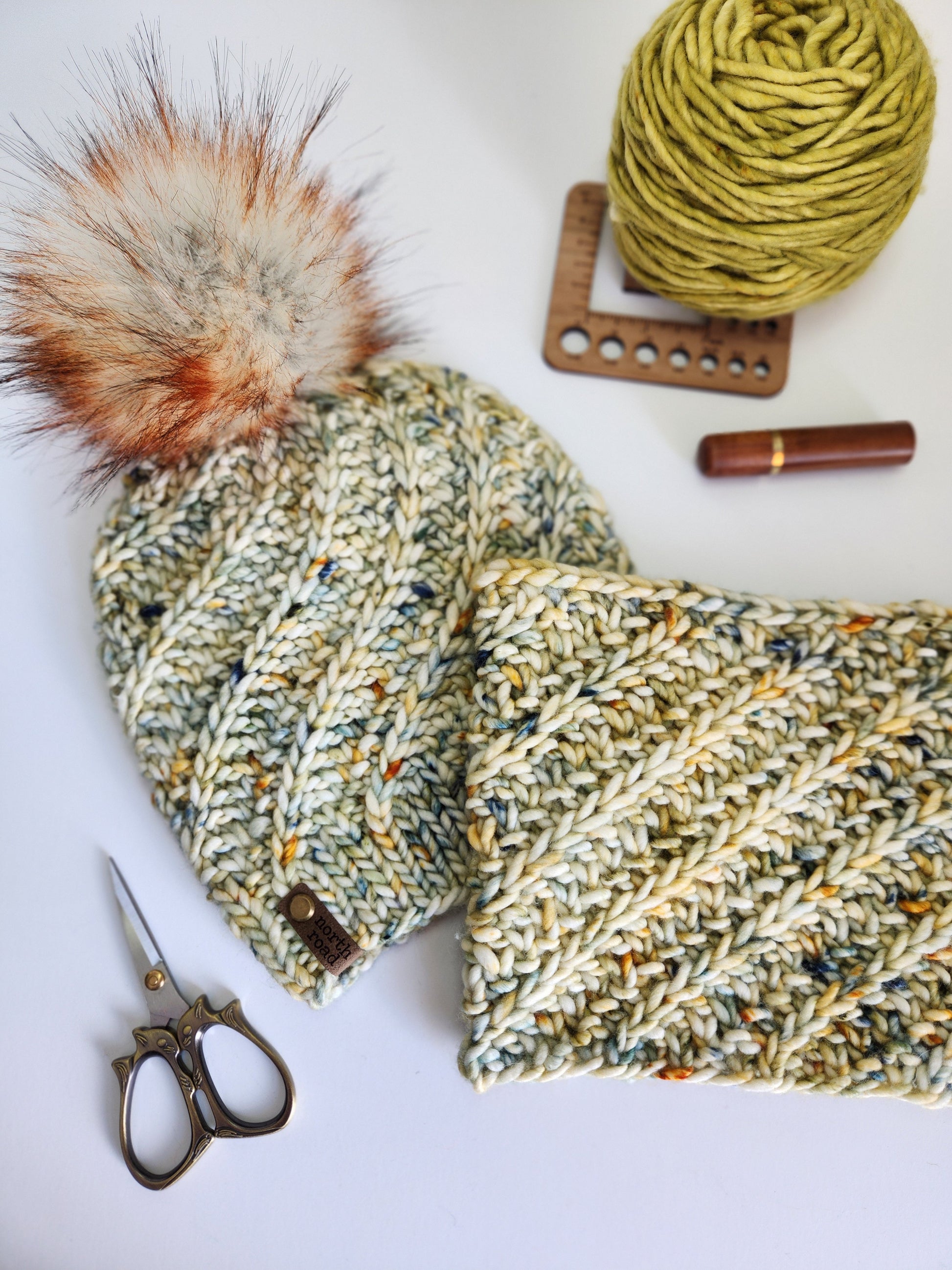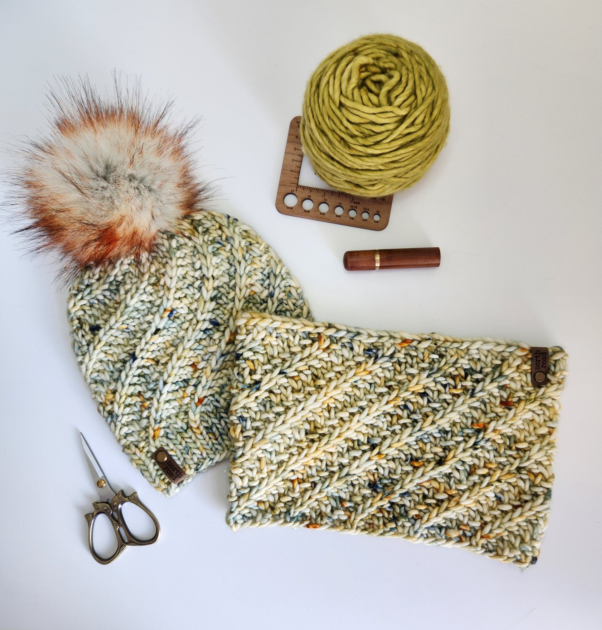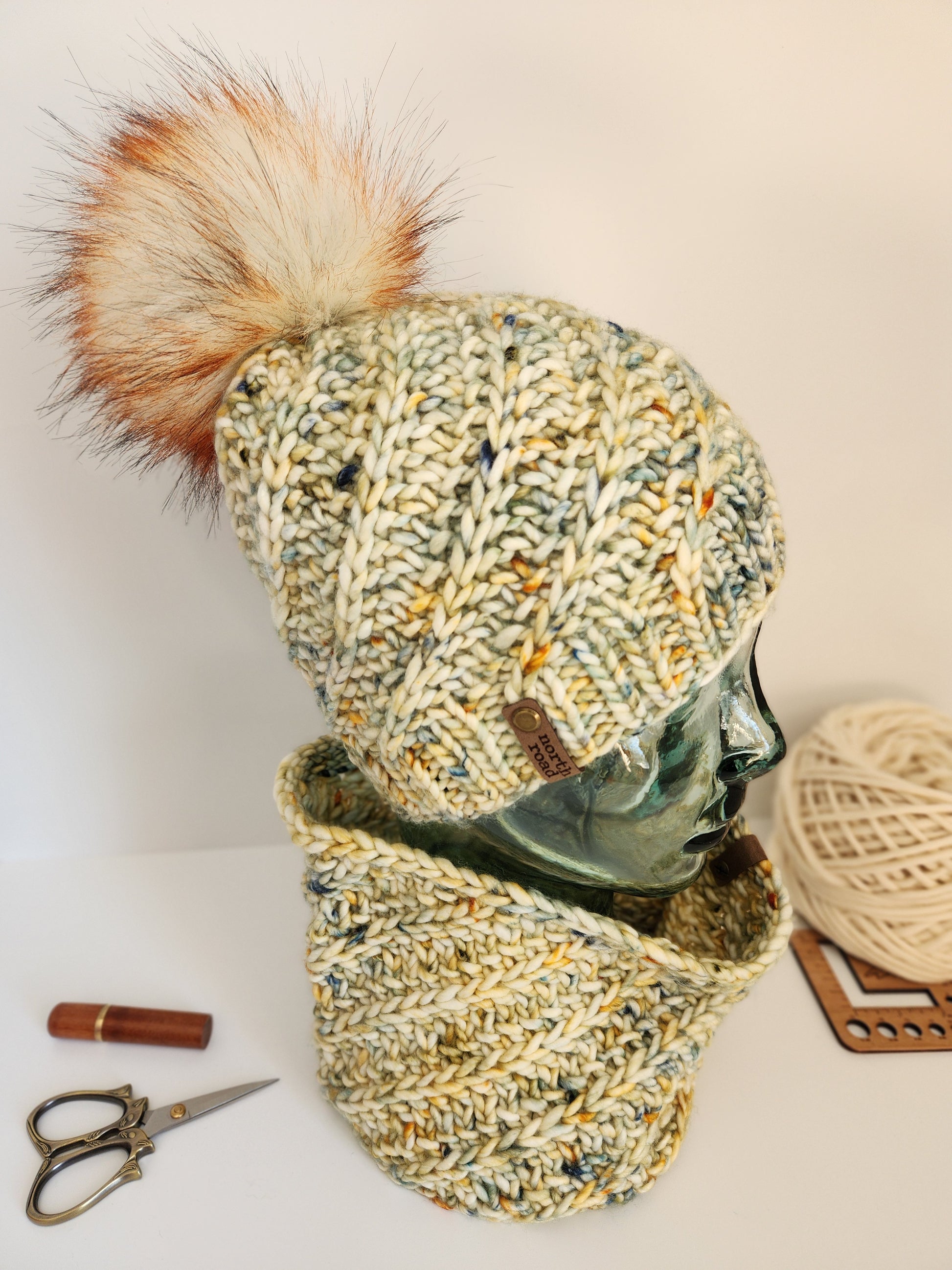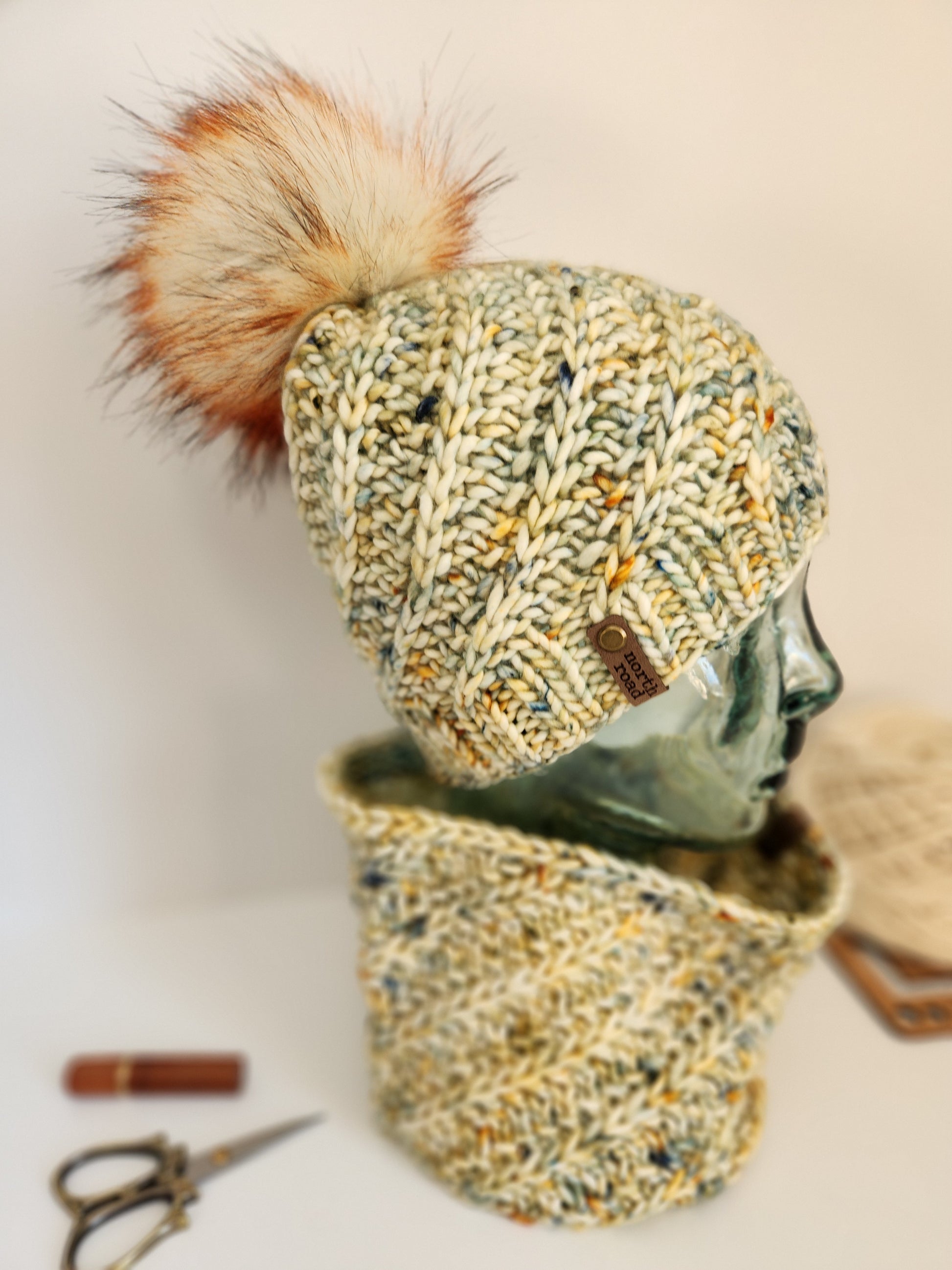 This hat and cowl were hand knit by me in my northeast Minnesota home.