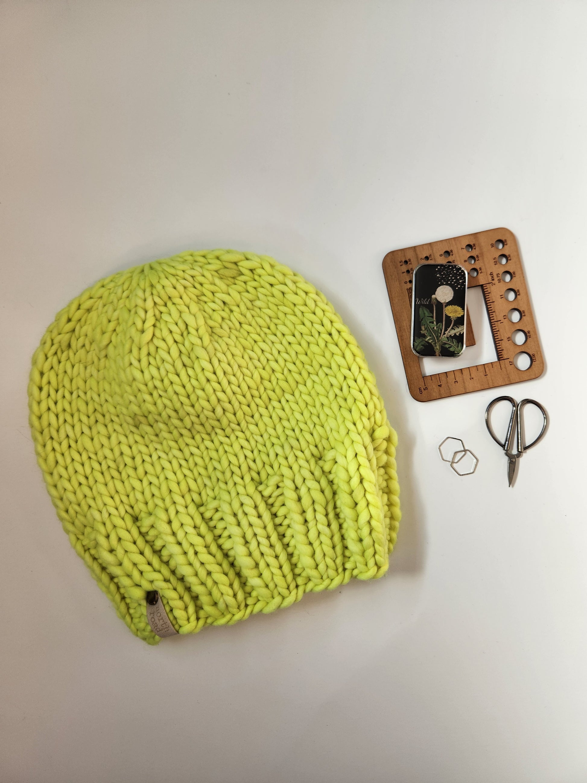The hat is made from a beautiful 100% merino wool yarn that is sustainably and ethically sourced, and hand dyed. Fits most average adult heads. Shown here on a glass mannequin head that measures 22" in circumference.