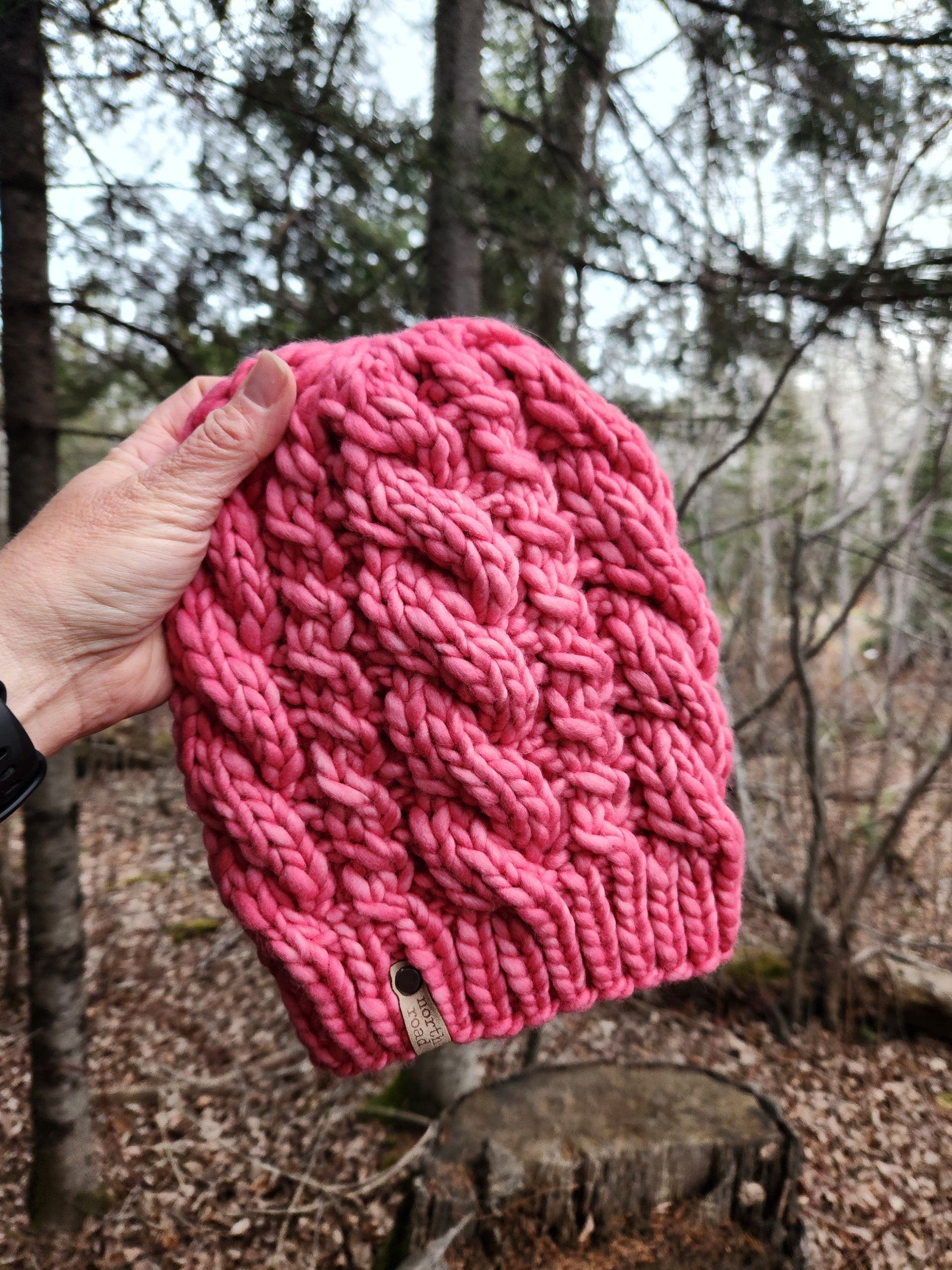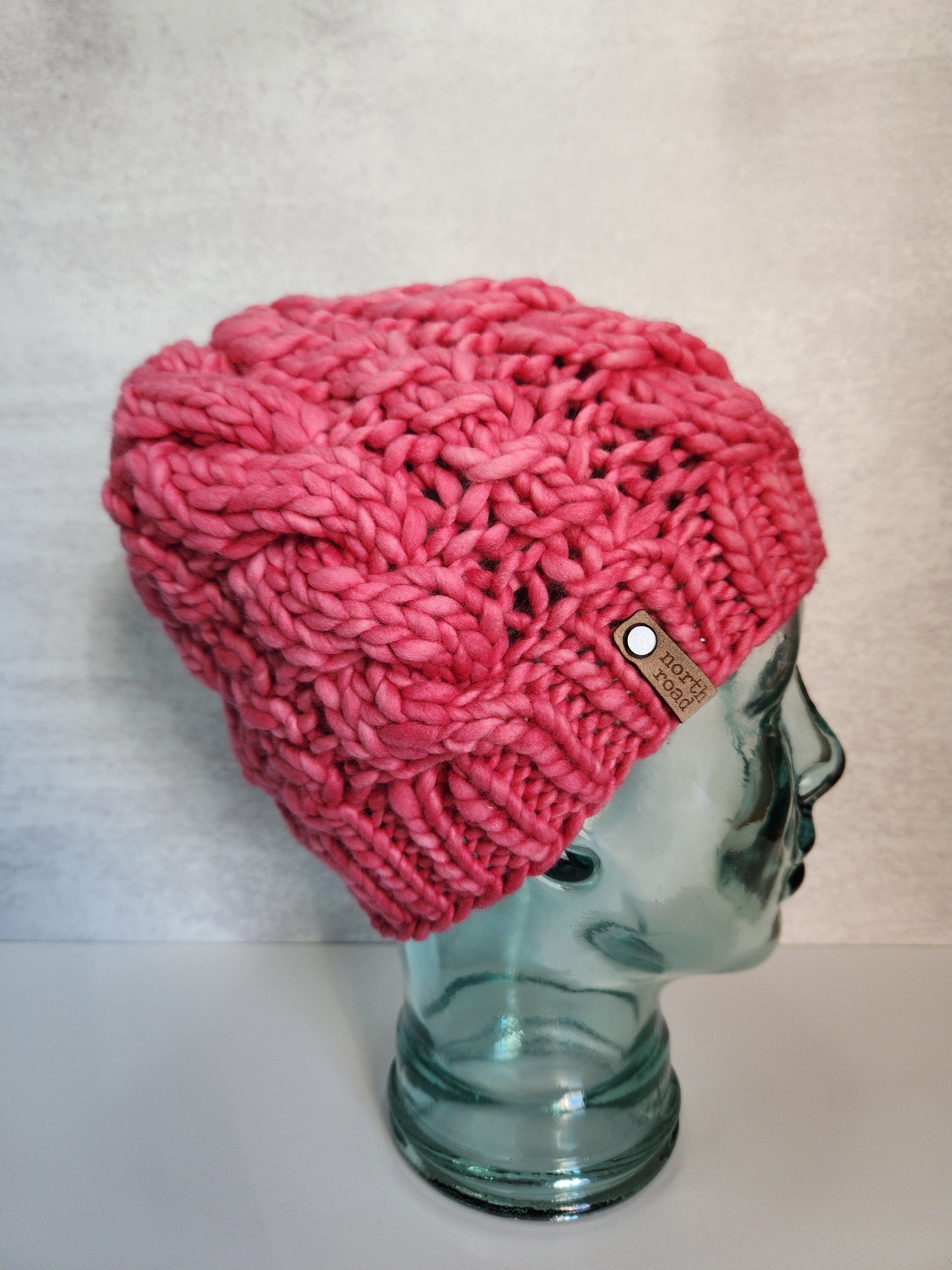 The hat is made from a beautiful 100% merino wool yarn that is sustainably and ethically sourced, and hand dyed. Fits most average adult heads. Shown here on a glass mannequin head that measures 22" in circumference.