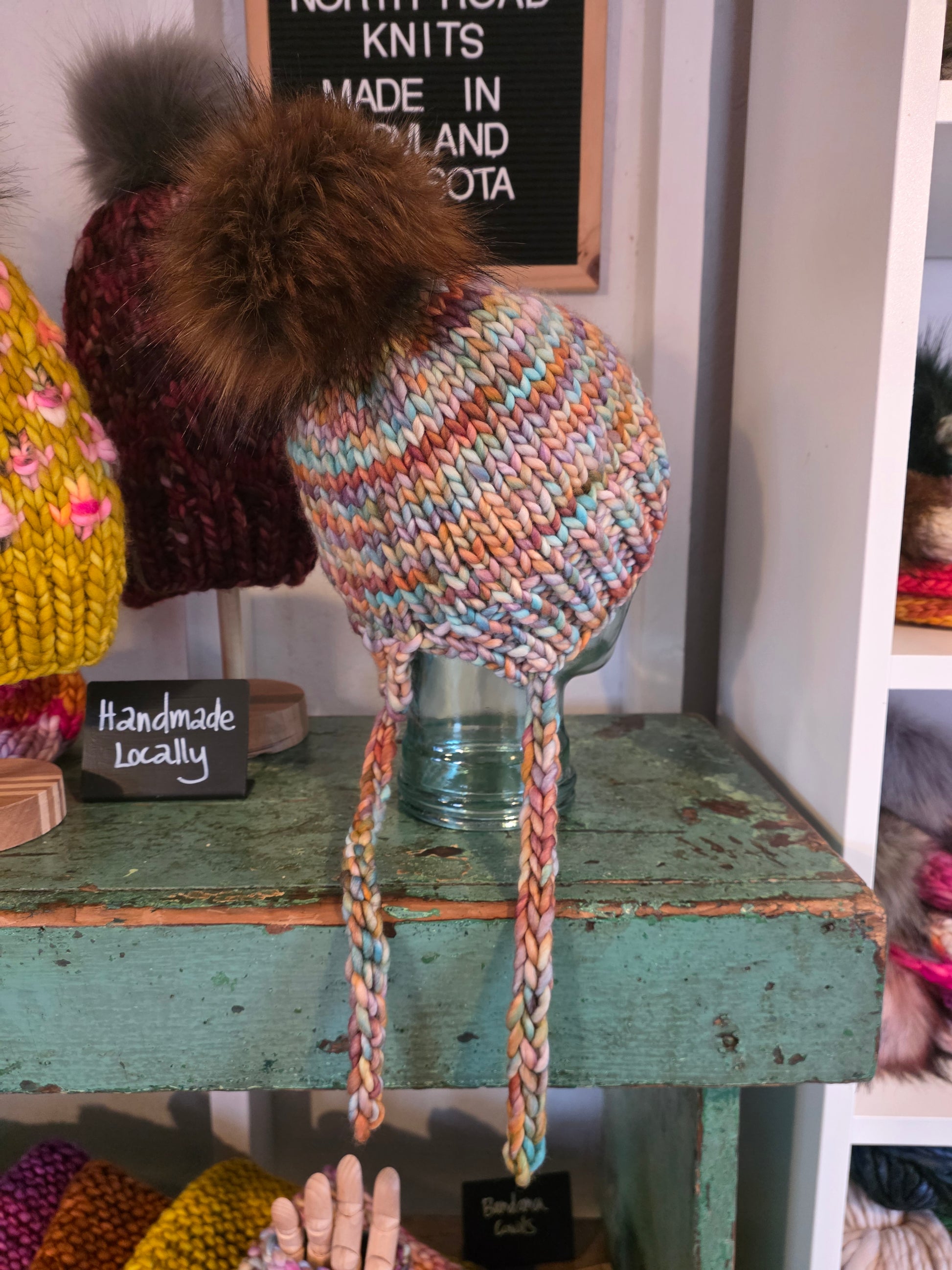 This hat was hand knit by me in my northeast Minnesota home.