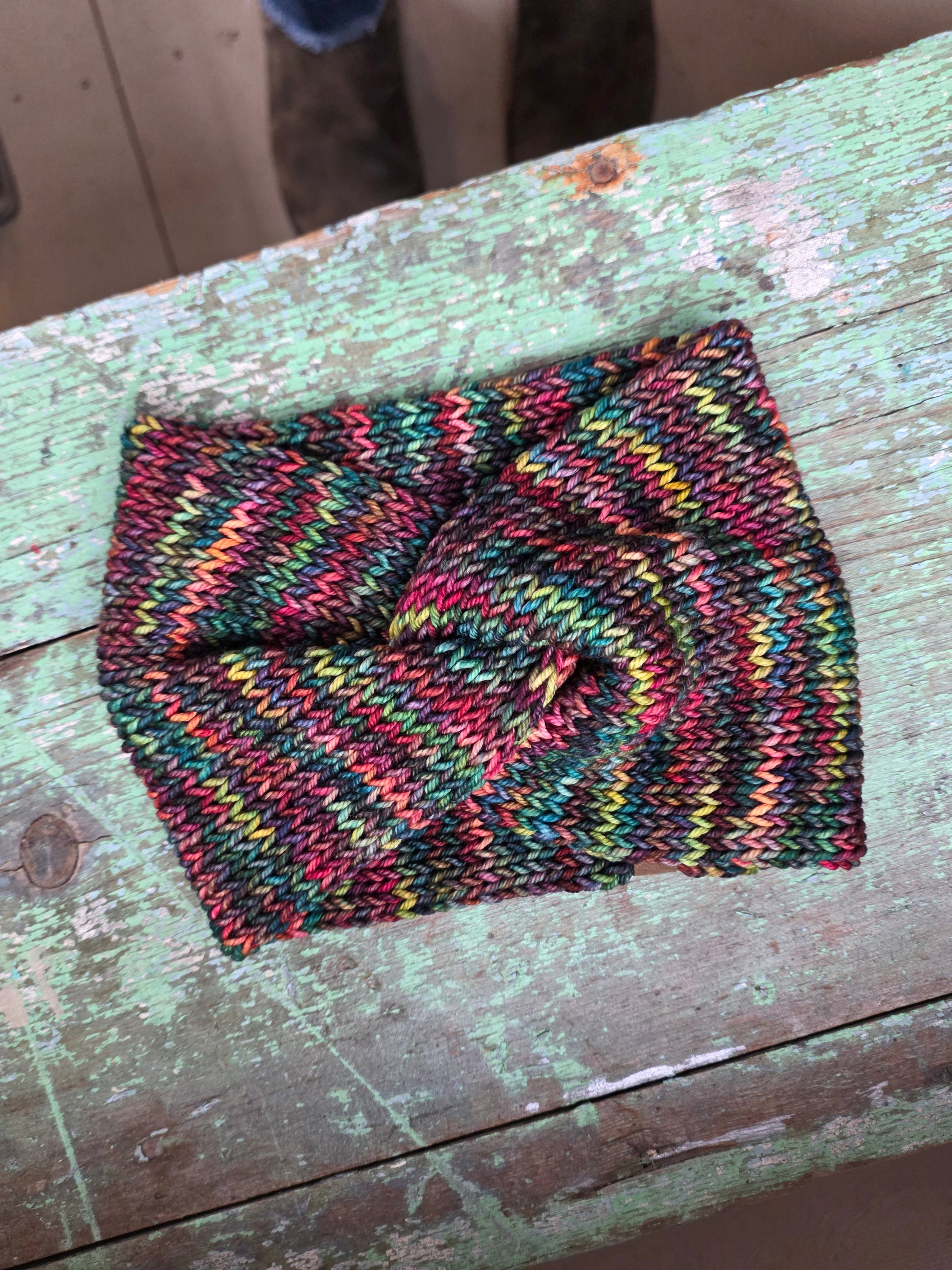 This headband was hand knit by me in my northeast Minnesota home.
