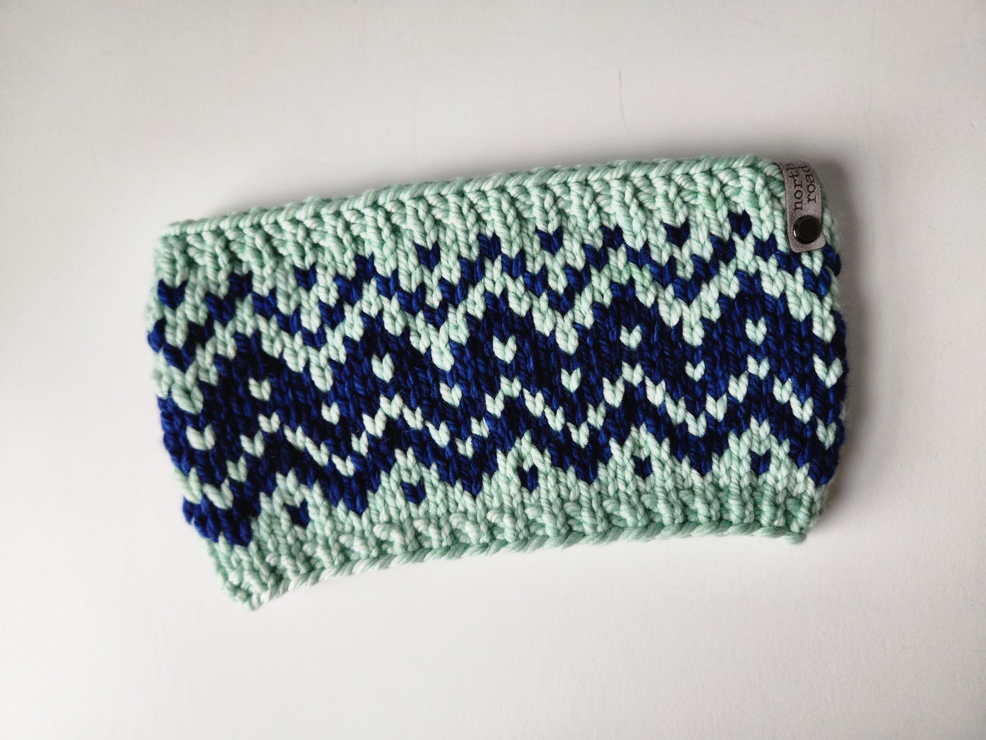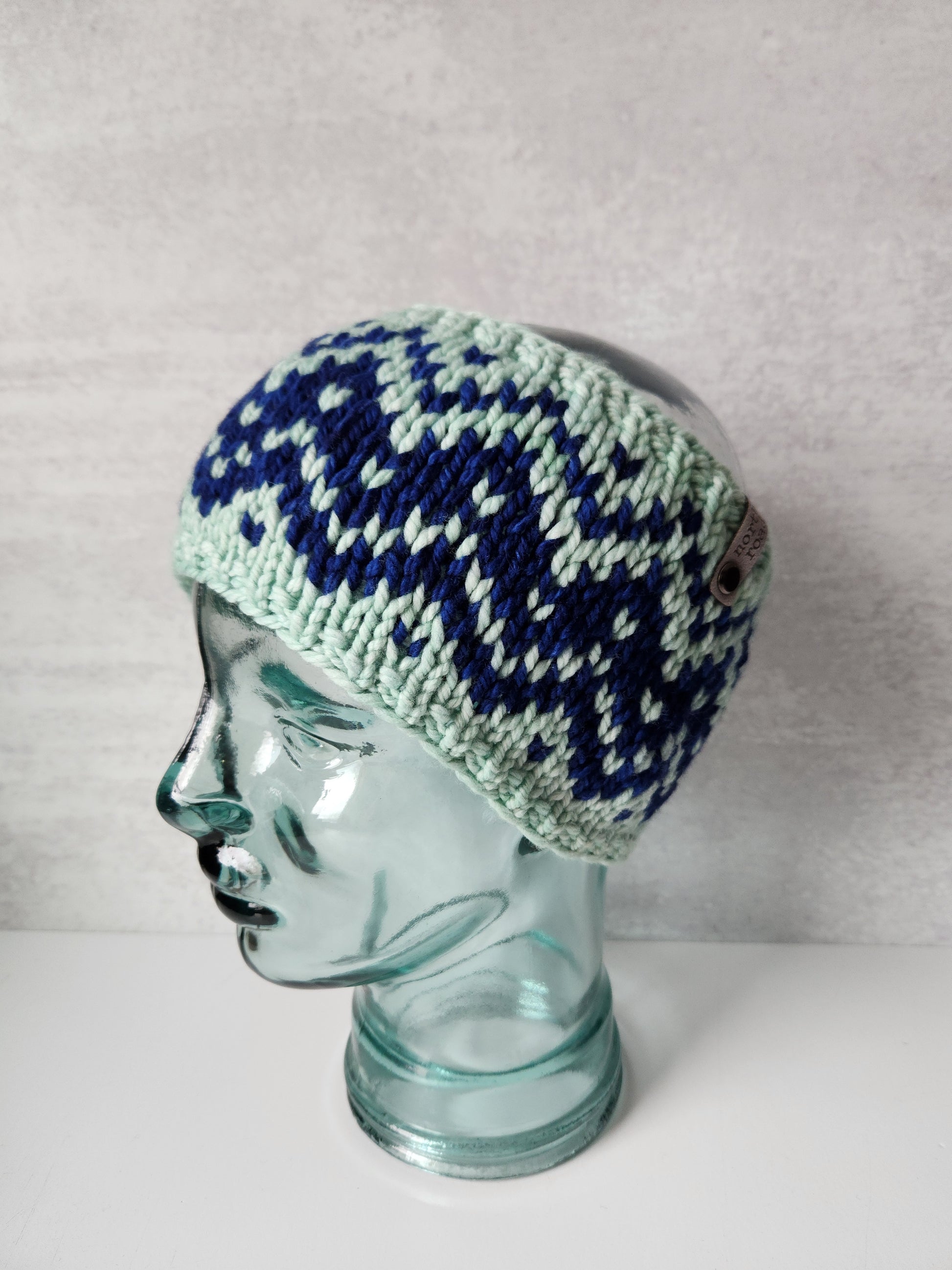 The headband is made from a beautiful 100% merino wool yarn that is sustainably and ethically sourced, and hand dyed. Fits most average adult heads. Shown here on a glass mannequin head that measures 22" in circumference.