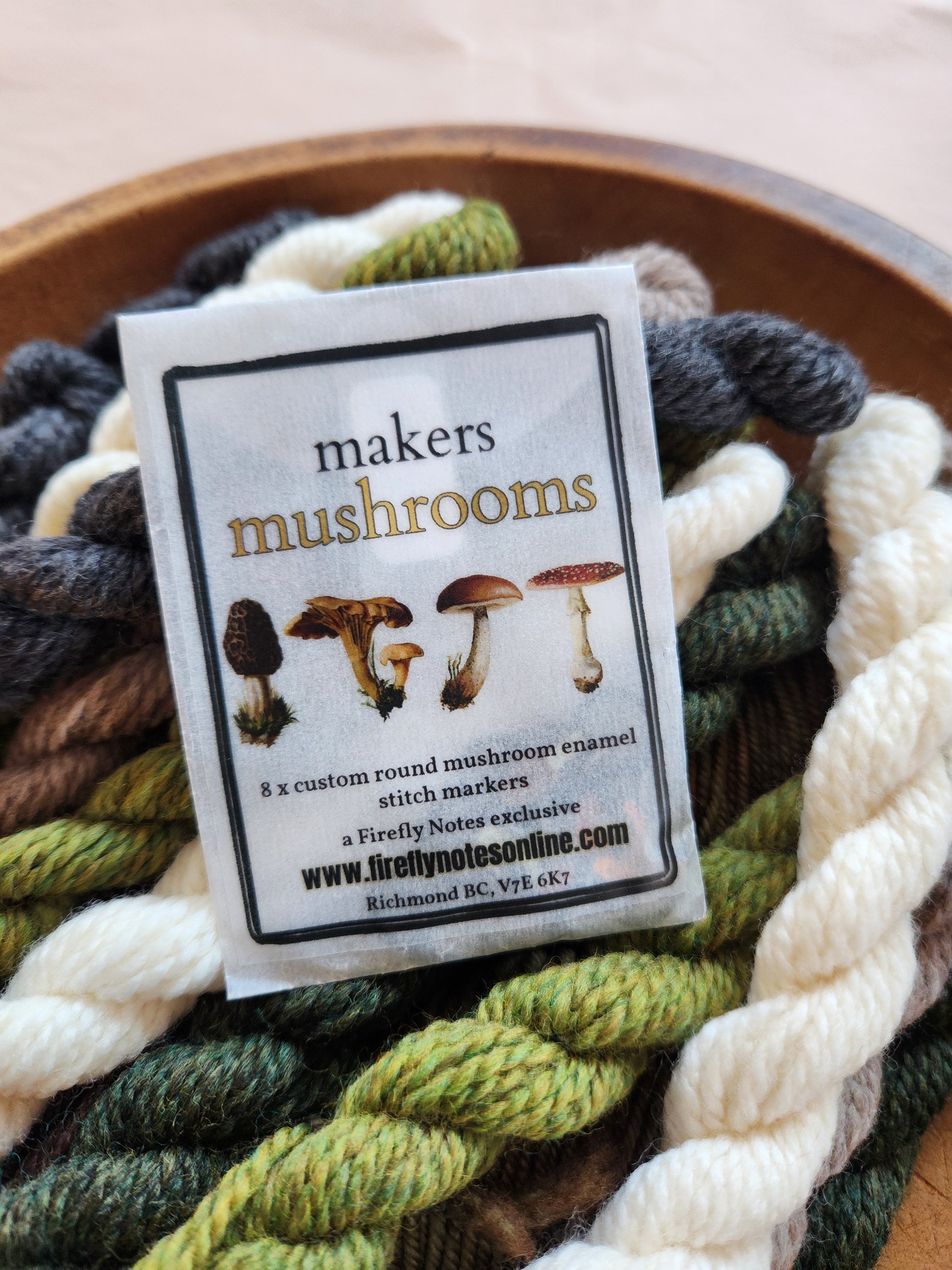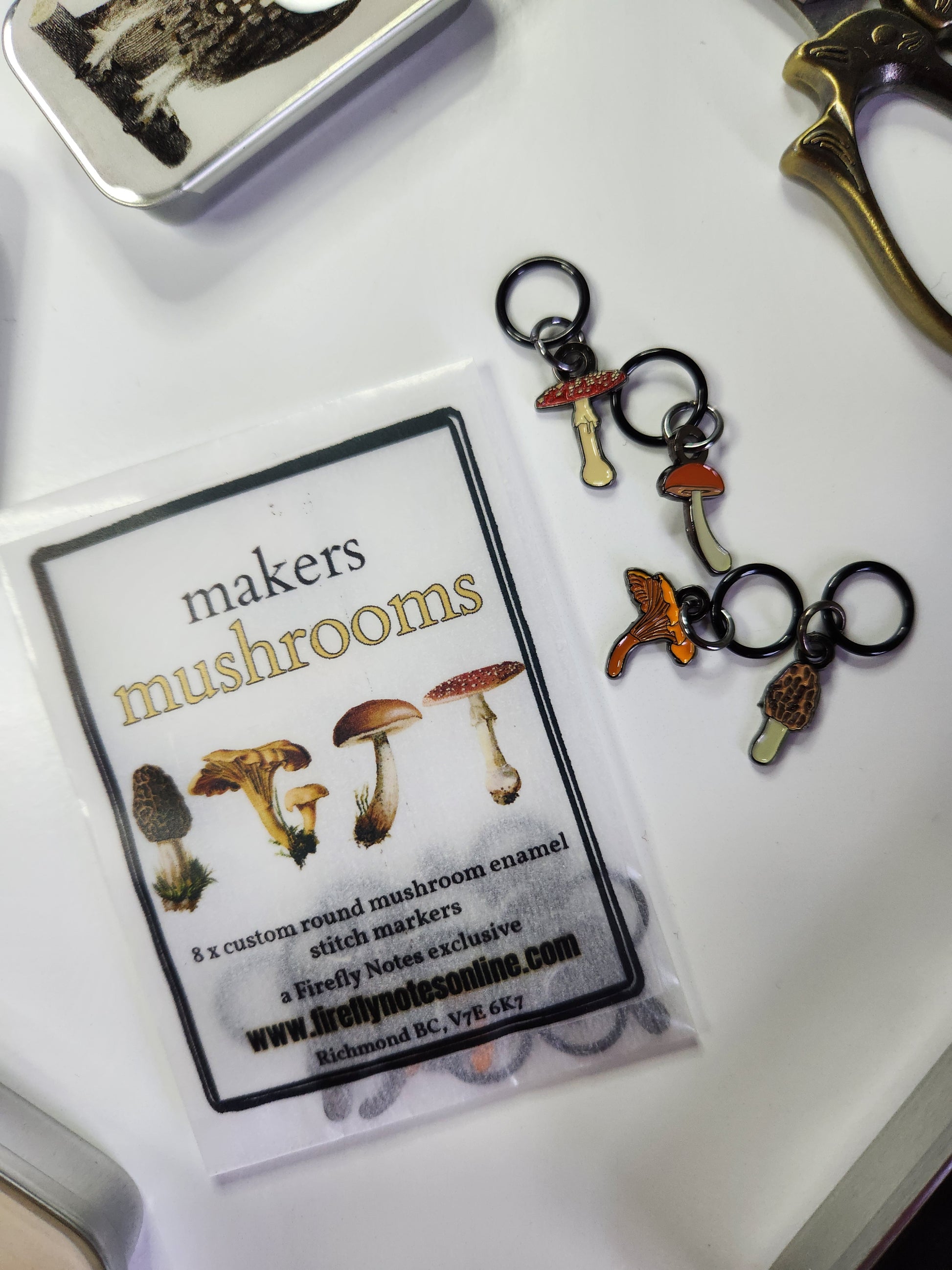 Firefly Notes enamel mushroom charms on 10mm round, no snag black rings.
