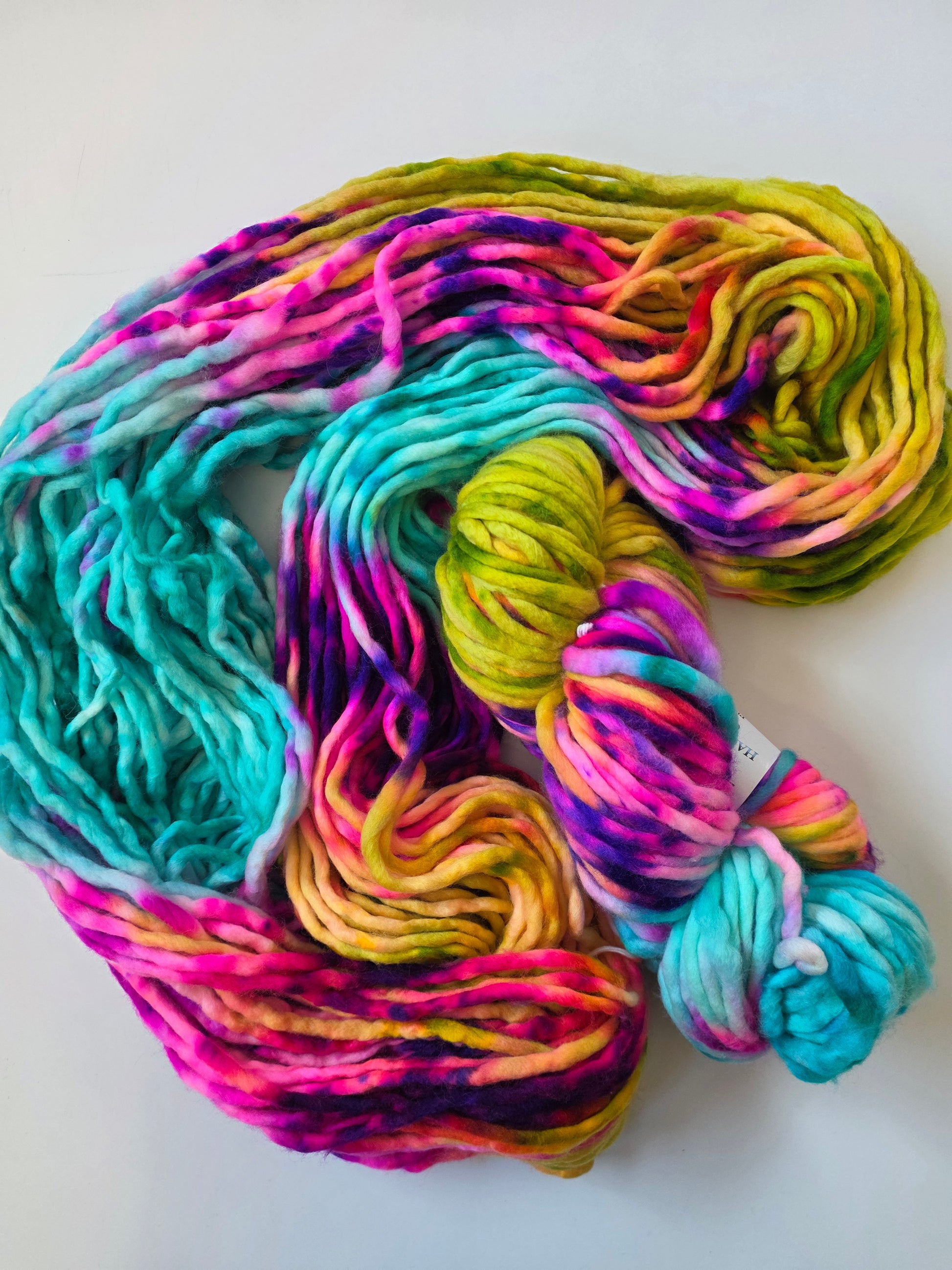 Hand dyed in Vernon, BC, Canada. Beautiful original colorways for one of kind knits in all your favorite Super Bulky patterns.