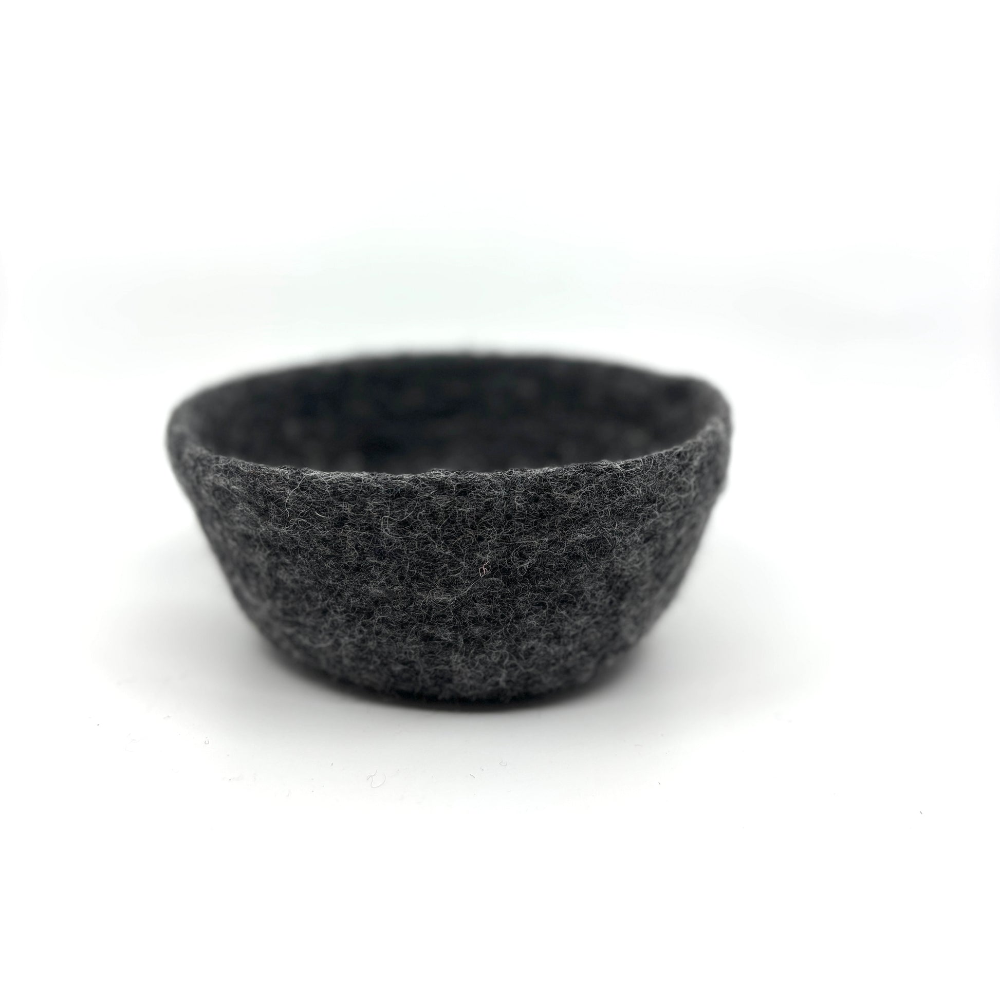 Our Small Felt Bowl, offered by Fibres of Life, is a part of our decorative dish collection, designed to be versatile and aesthetically pleasing. The preset mix of monochromes and colors ensures that this bowl fits seamlessly into any decor. Crafted from 100% natural wool, azo-free dyes, and natural-death and naturally tanned leather, this bowl is a testament to our commitment to fair trade and eco-friendly practices.