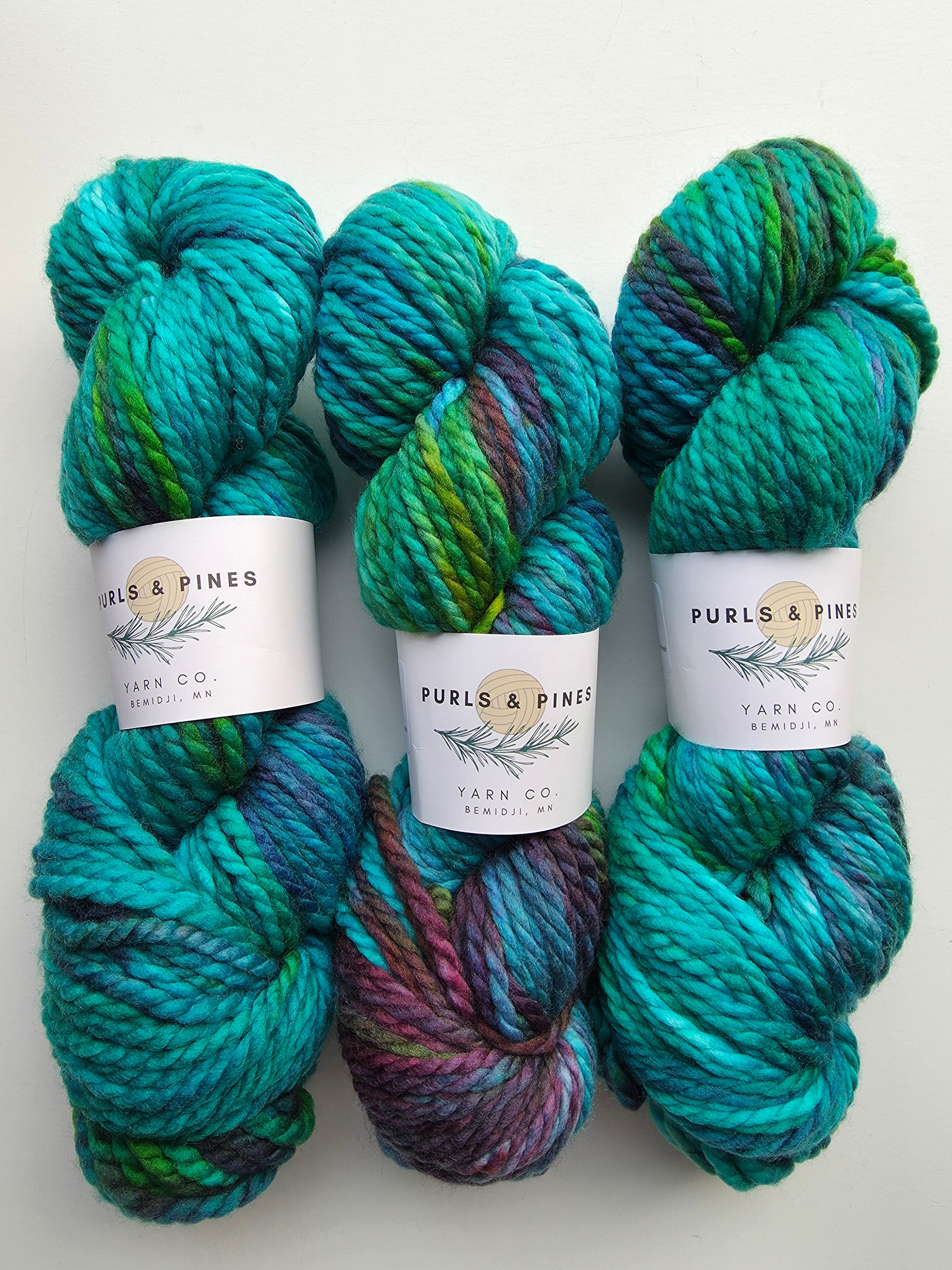 You have been asking me for some Minnesota-dyed yarn, so I am so excited to have Purls and Pine in the shop now! Here is Purls and Pines Chunky Weight Superwash Merino Wool Hand Dyed Yarn.