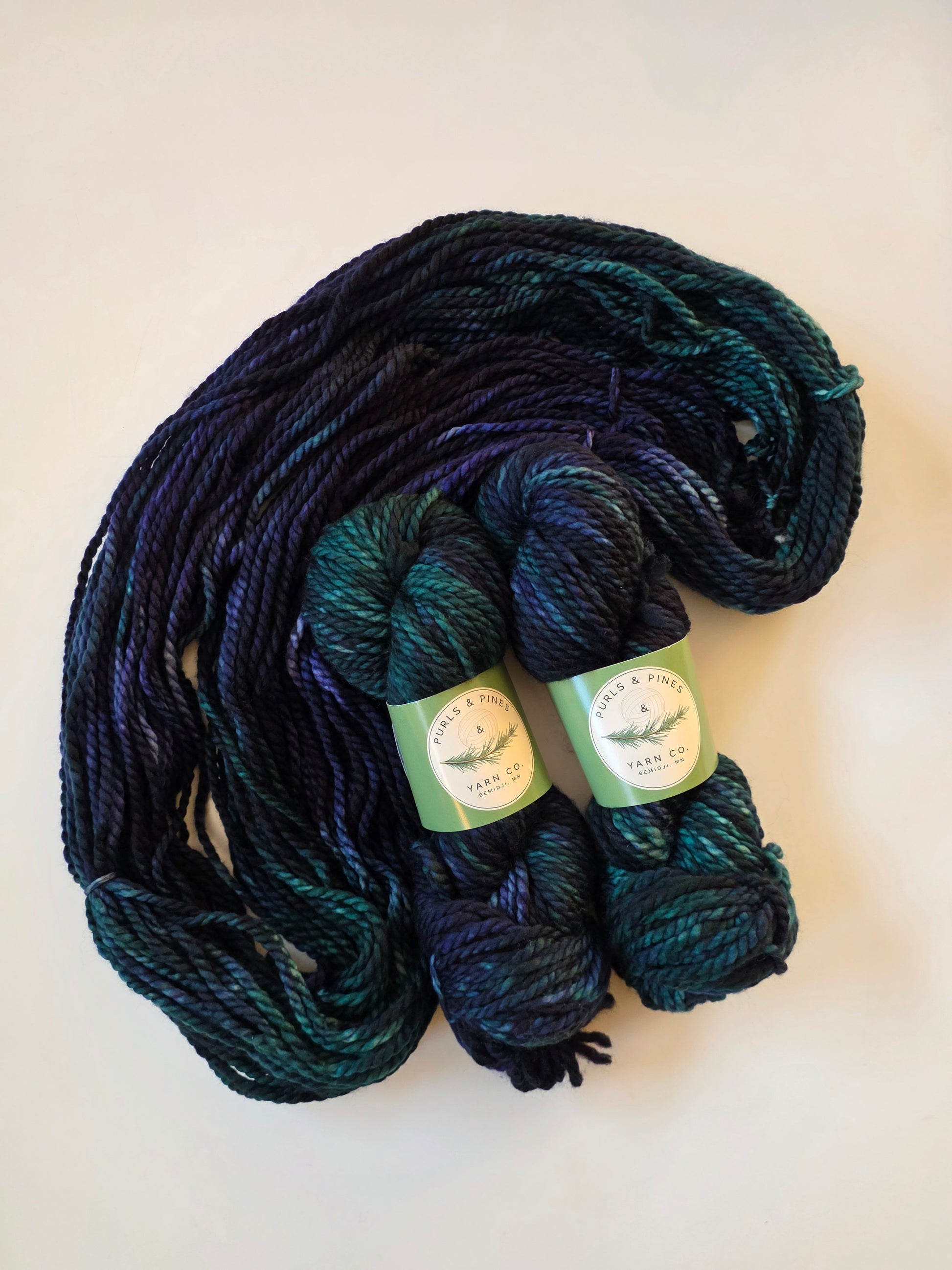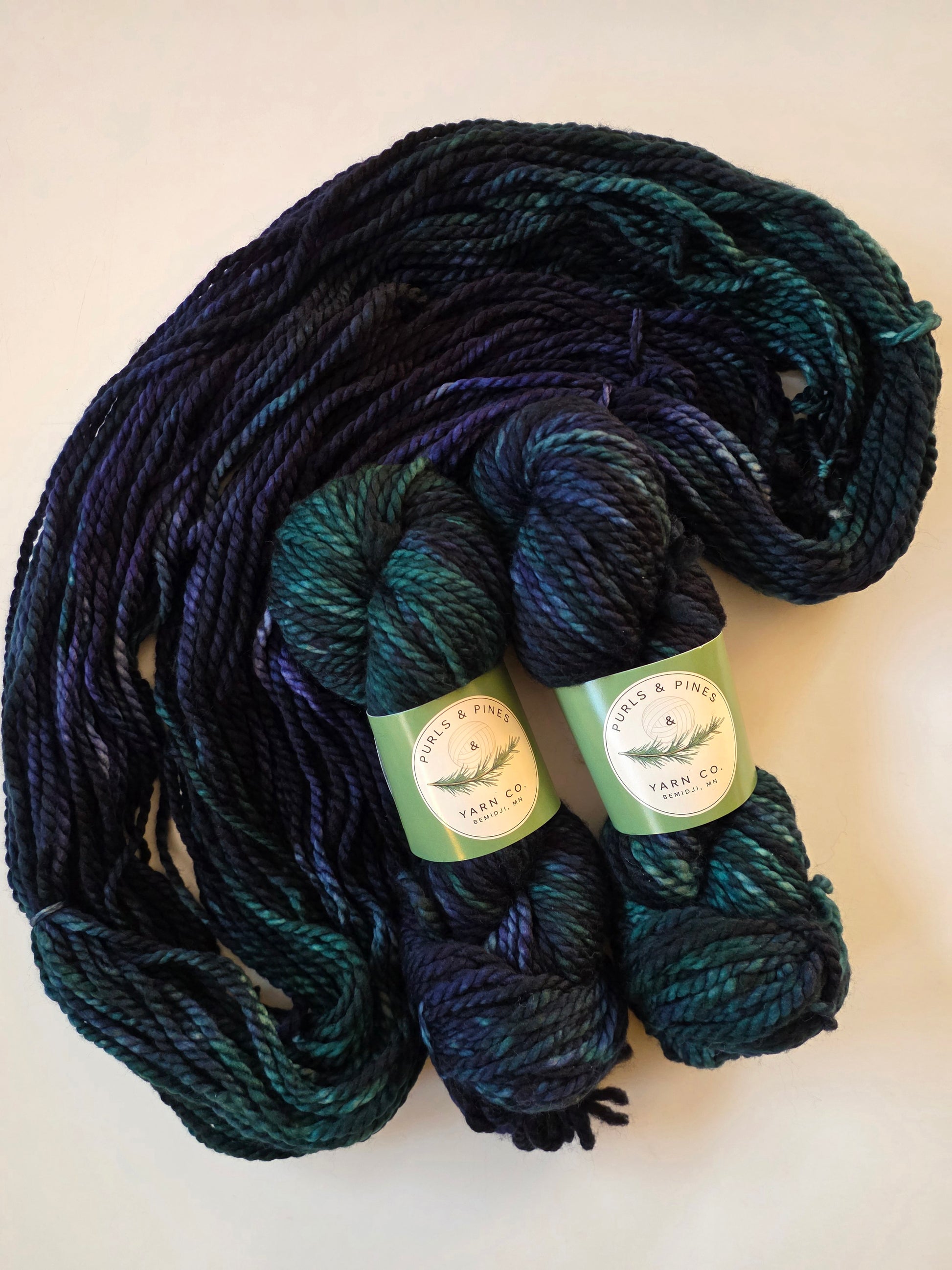 You have been asking me for some Minnesota-dyed yarn, so I am so excited to have Purls and Pine in the shop now! Here is Purls and Pines Chunky Weight Superwash Merino Wool Hand Dyed Yarn.