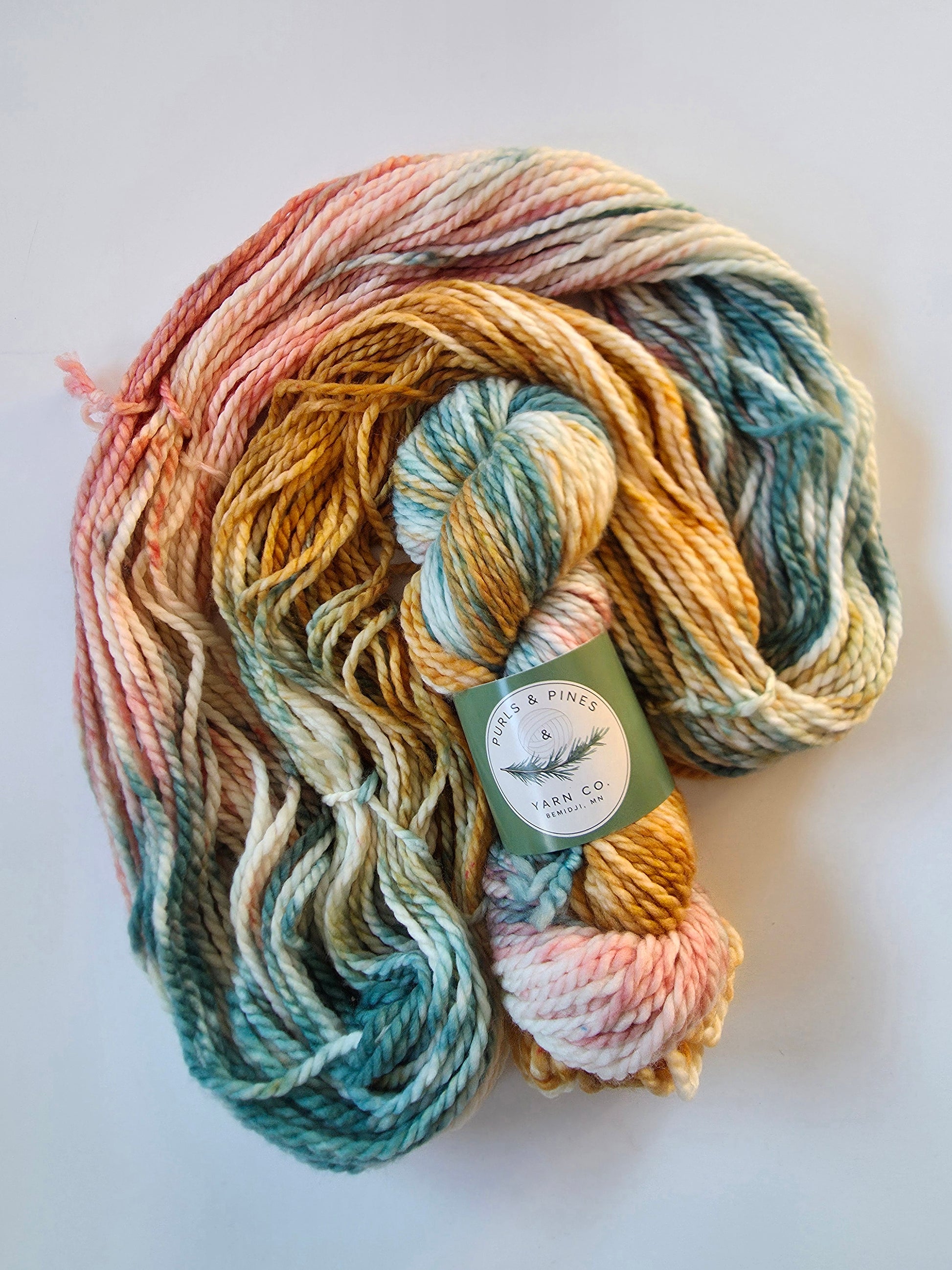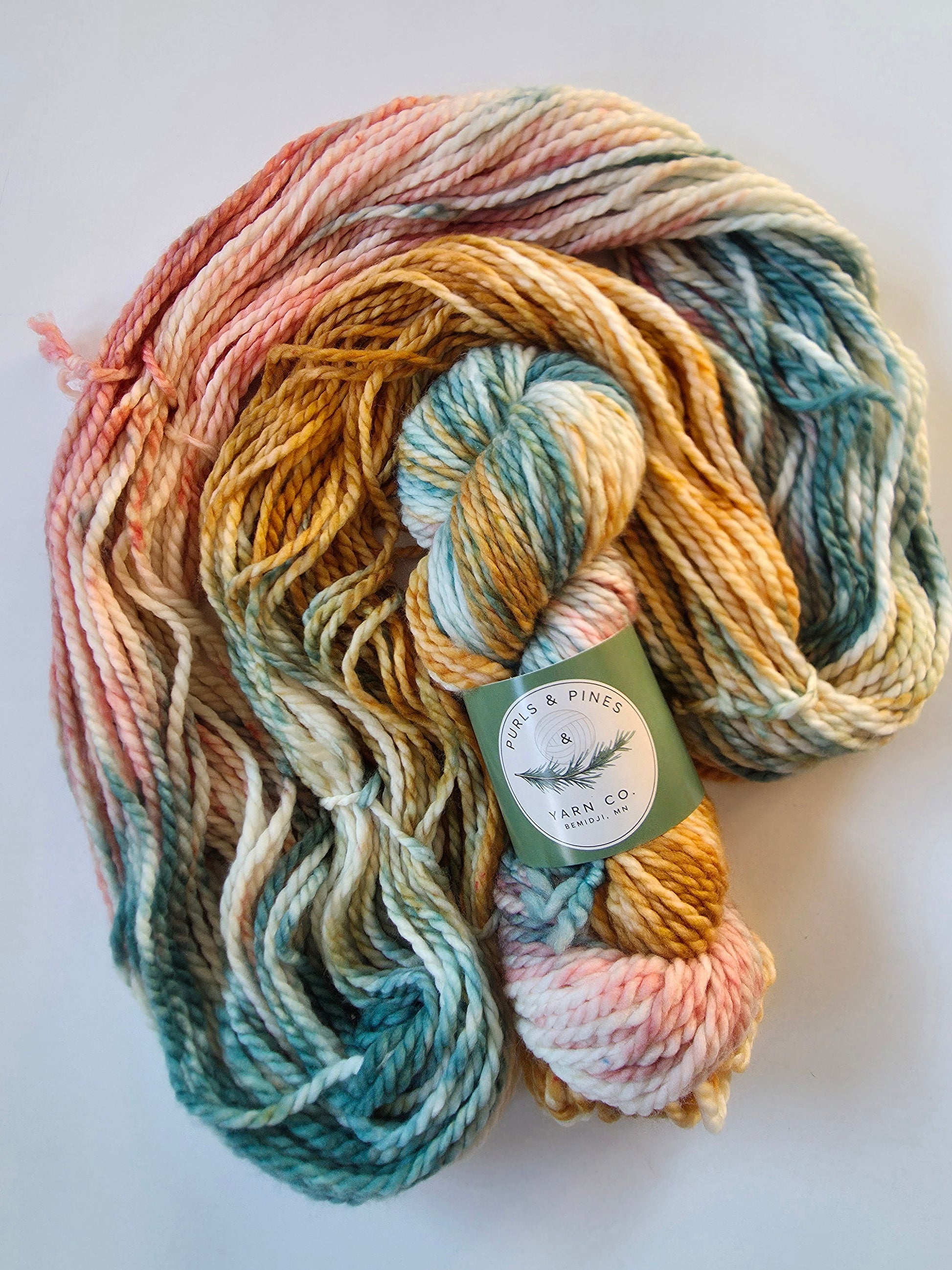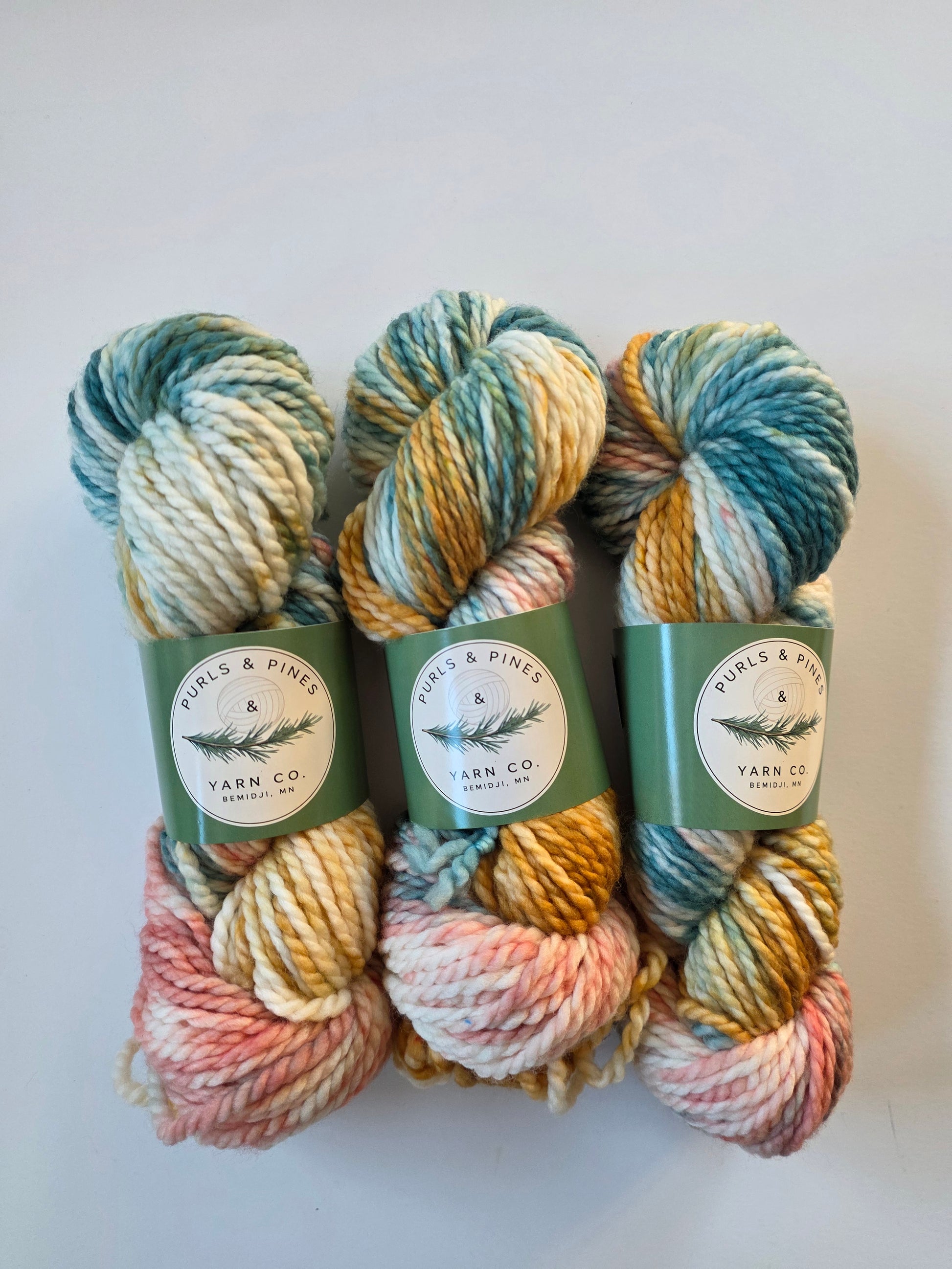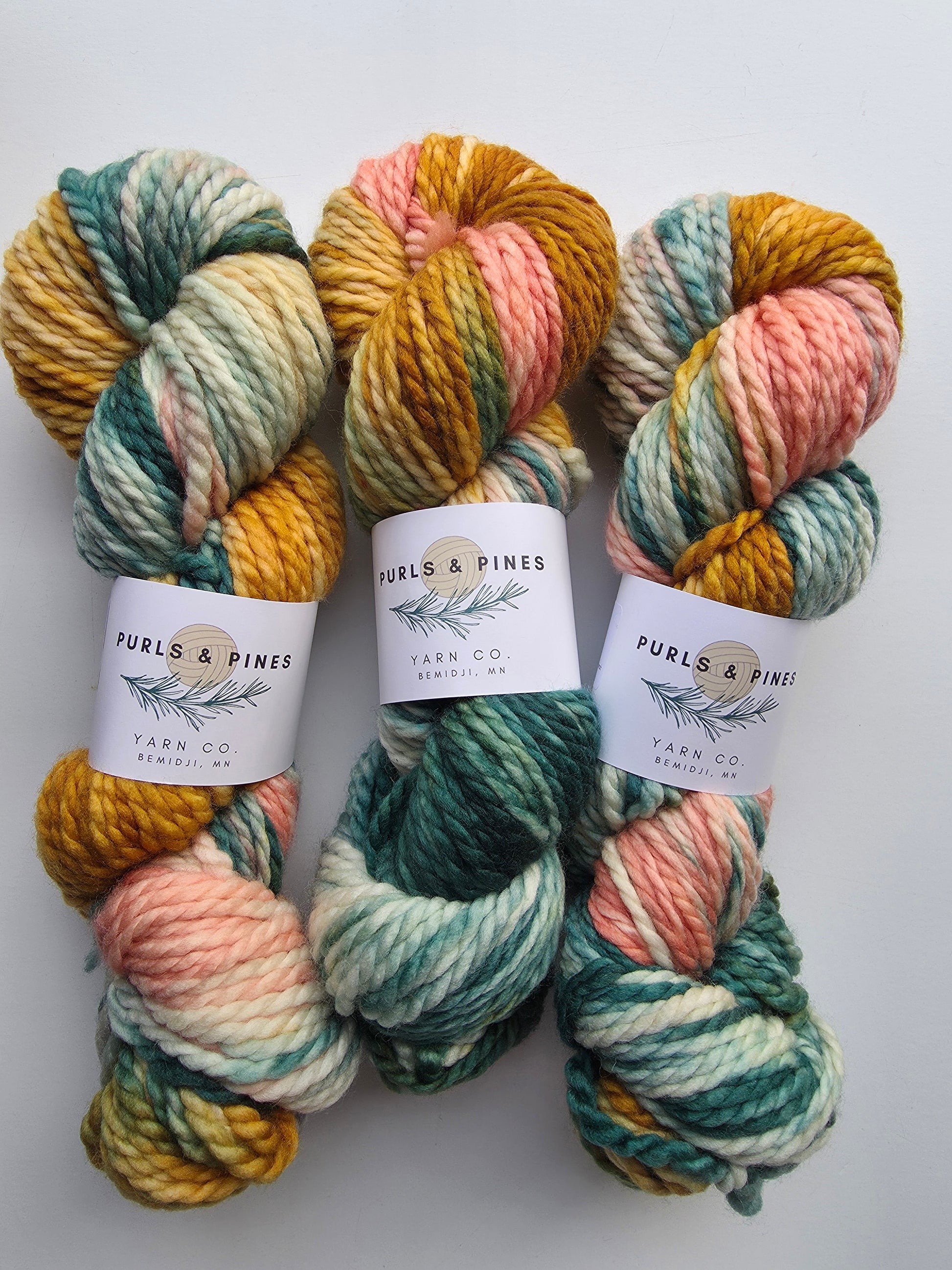 You have been asking me for some Minnesota-dyed yarn, so I am so excited to have Purls and Pine in the shop now! Here is Purls and Pines Chunky Weight Superwash Merino Wool Hand Dyed Yarn.