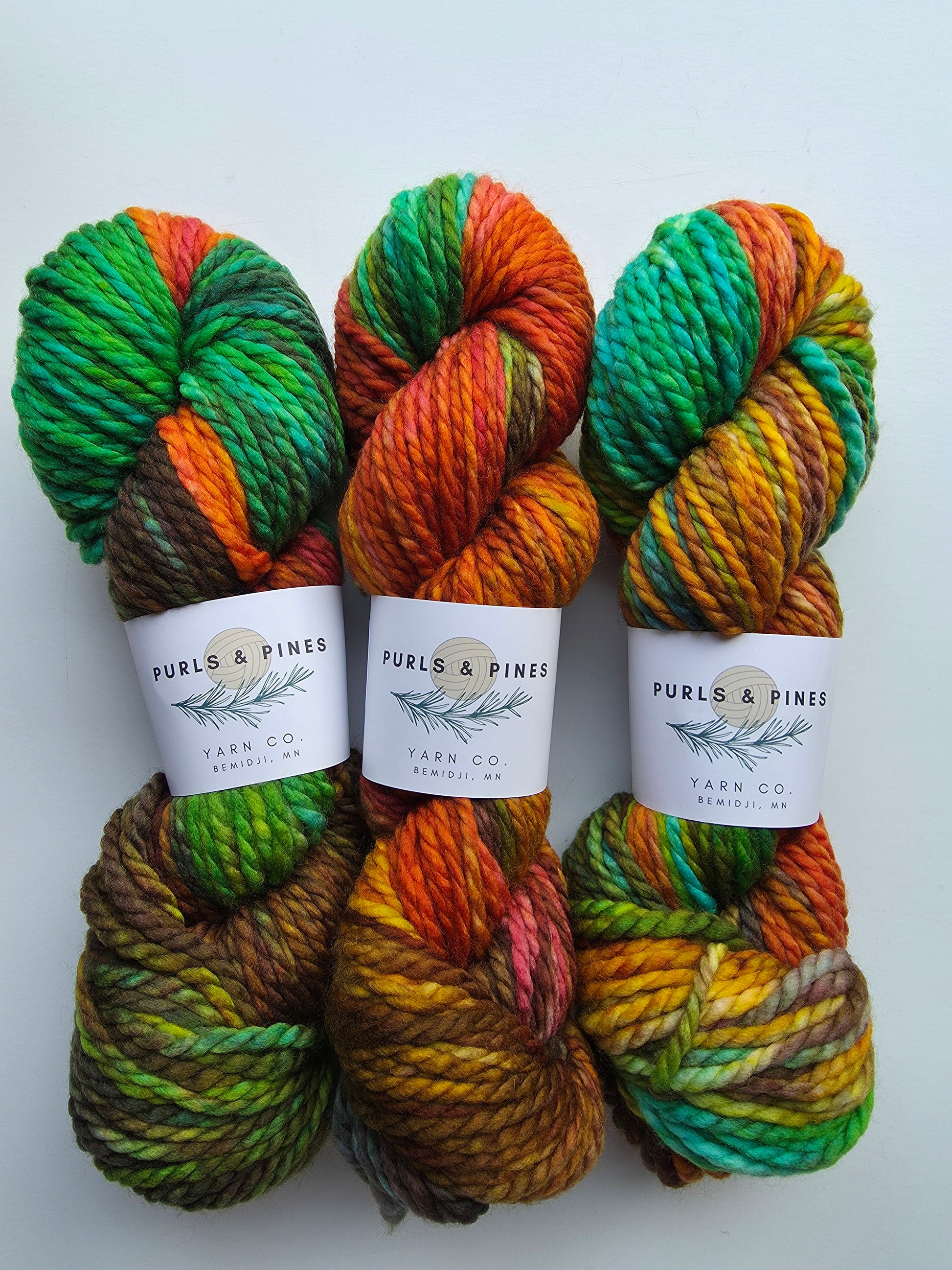 You have been asking me for some Minnesota-dyed yarn, so I am so excited to have Purls and Pine in the shop now! Here is Purls and Pines Chunky Weight Superwash Merino Wool Hand Dyed Yarn.