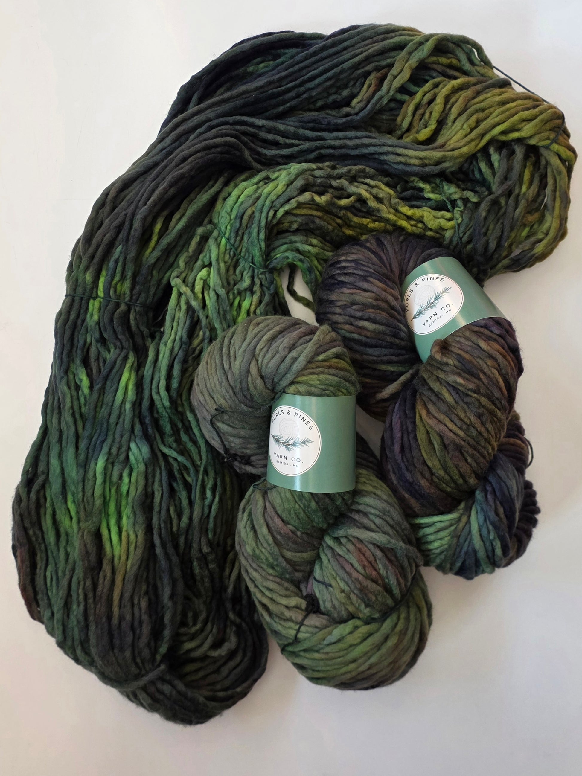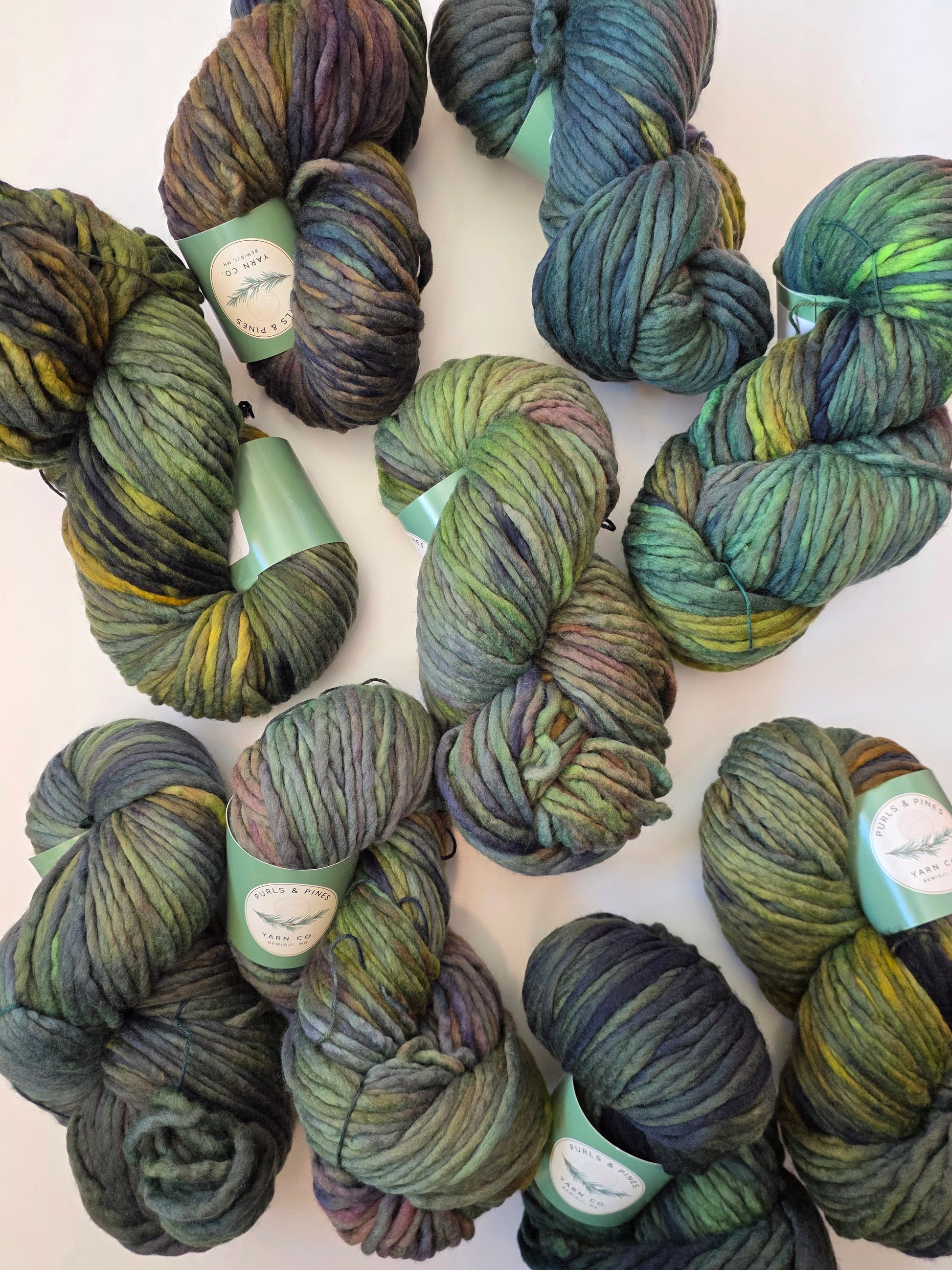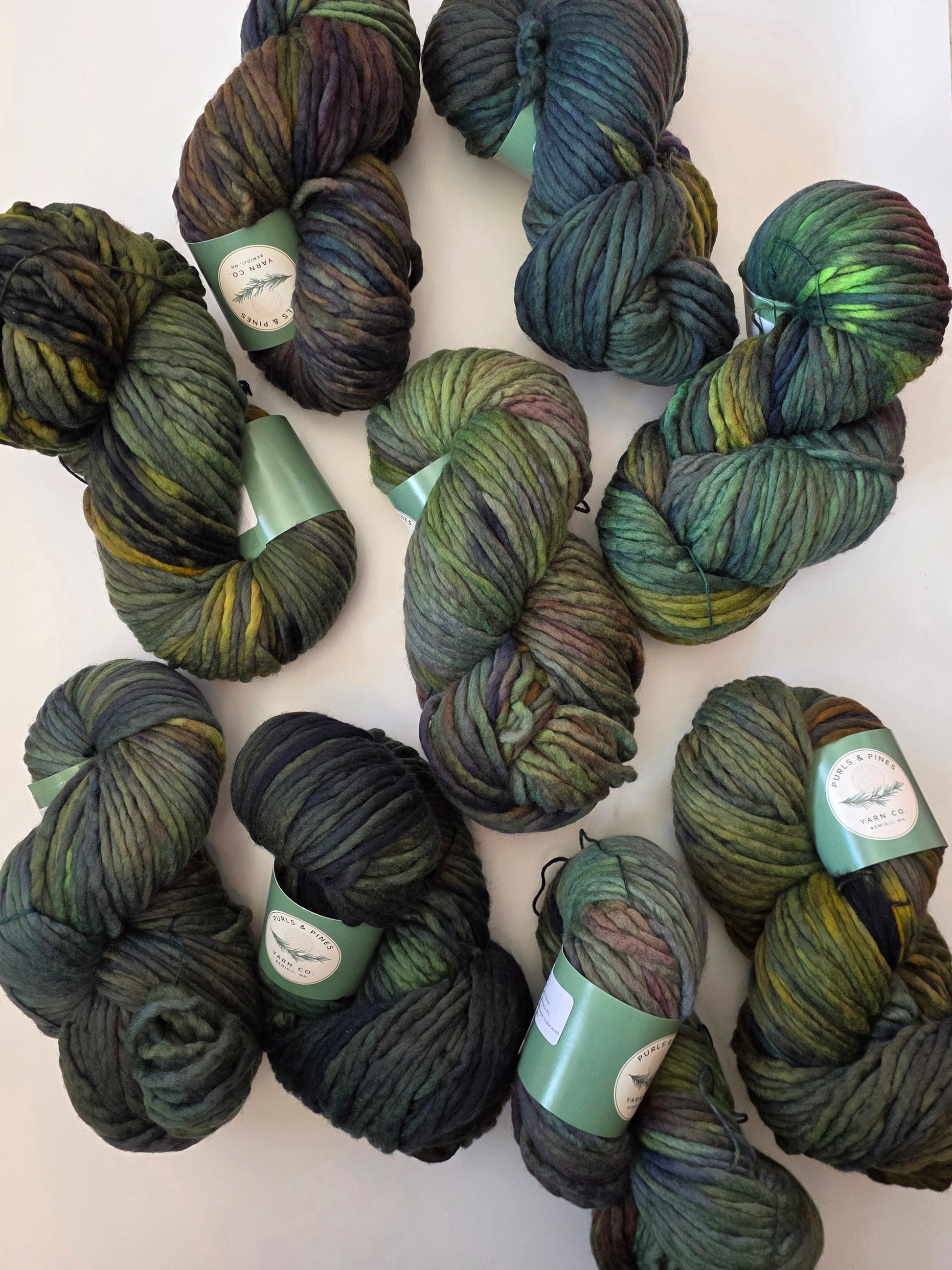 You have been asking me for some Minnesota-dyed yarn, so I am so excited to have Purls and Pine in the shop now! Here is Purls and Pines Super Bulky Weight Super Wash Merino Wool hand dyed Yarn.