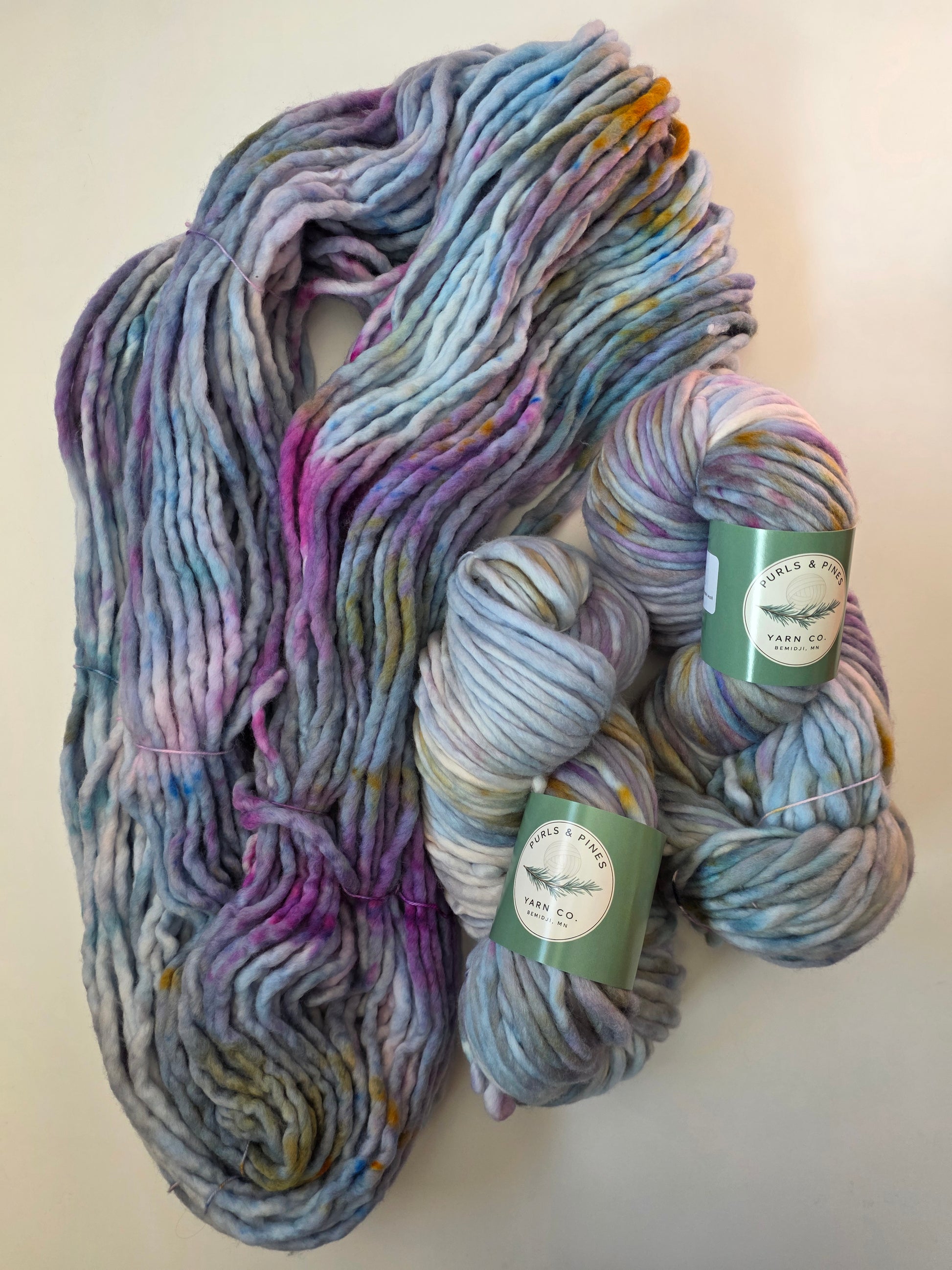 You have been asking me for some Minnesota-dyed yarn, so I am so excited to have Purls and Pine in the shop now! Here is Purls and Pines Super Bulky Weight Super Wash Merino Wool hand dyed Yarn.