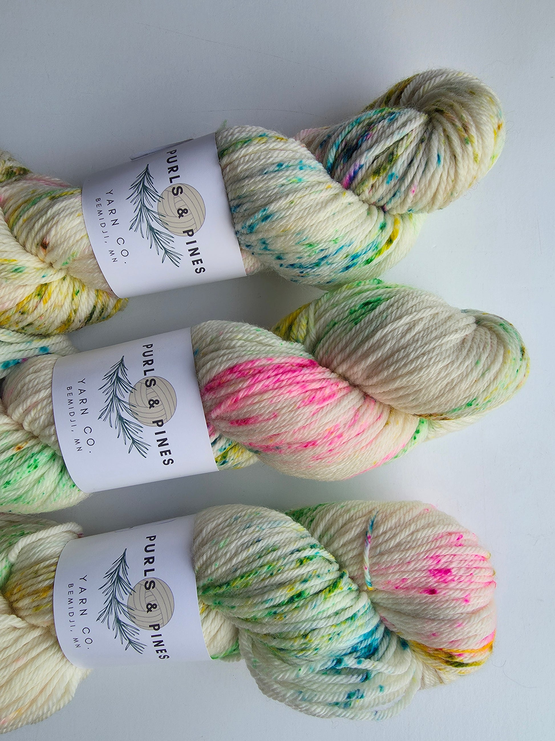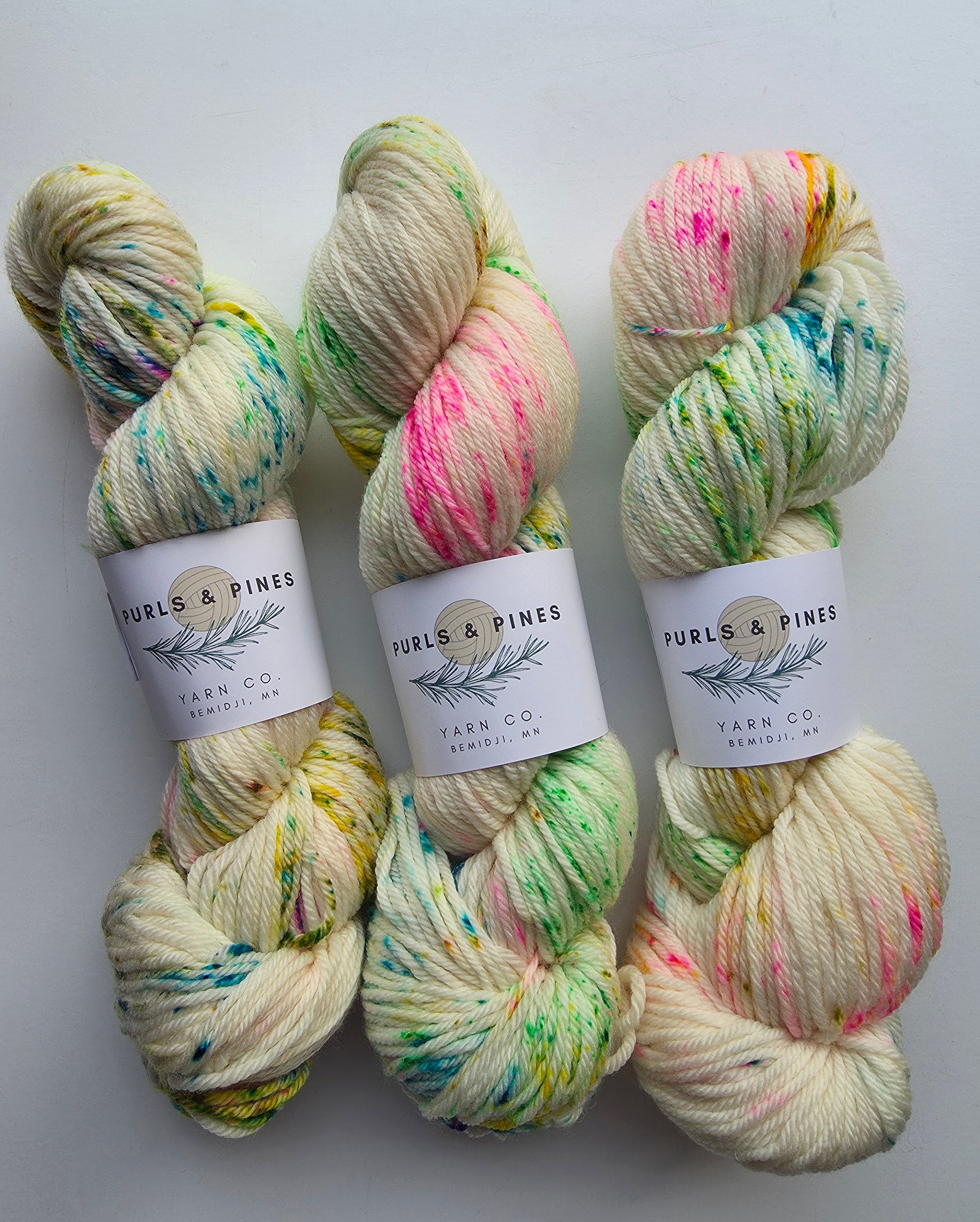 You have been asking me for some Minnesota-dyed yarn, so I am so excited to have Purls and Pine in the shop now! Here is Purls and Pines Worsted Weight Super Wash Merino Wool hand dyed Yarn.