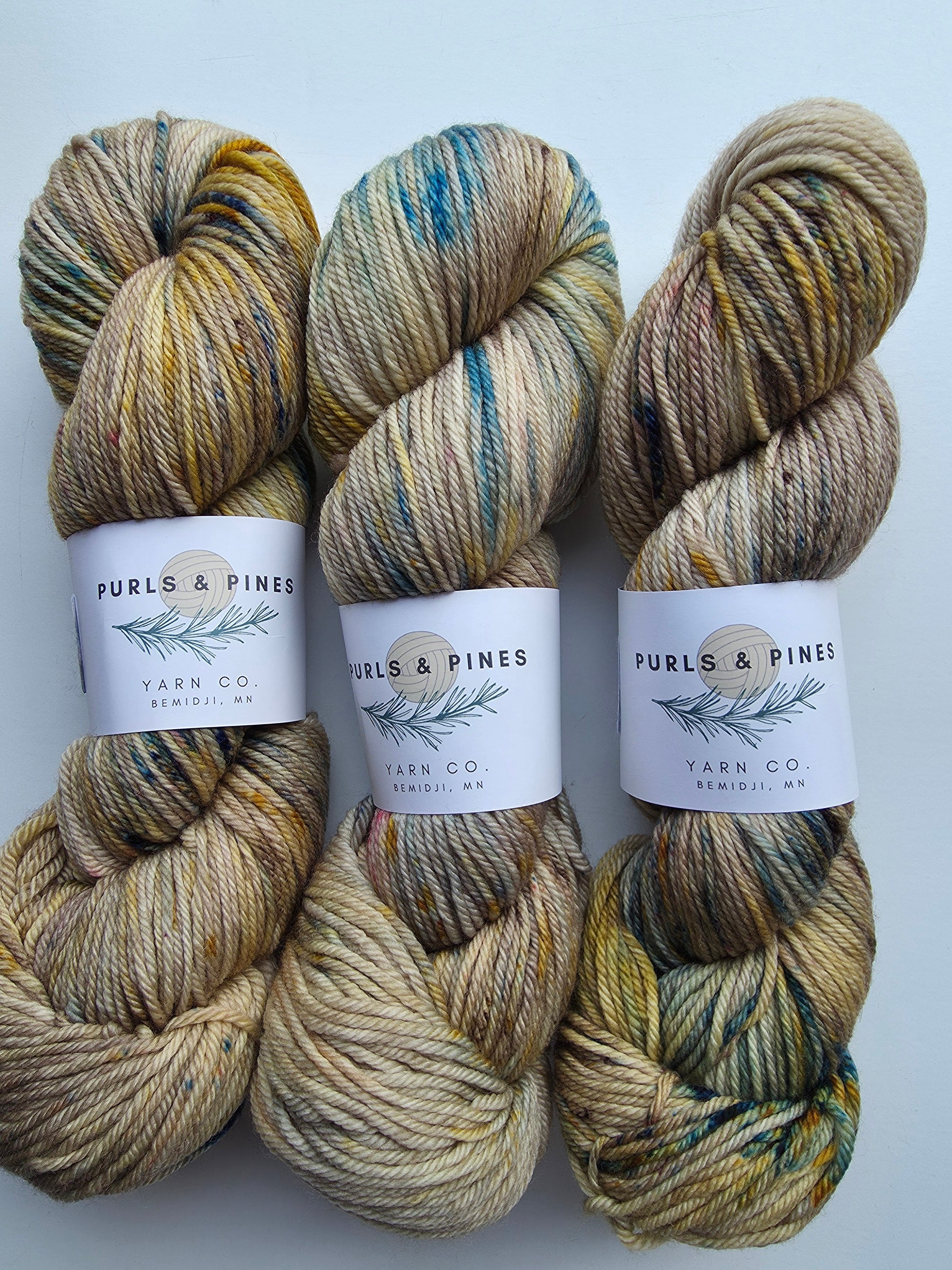 You have been asking me for some Minnesota-dyed yarn, so I am so excited to have Purls and Pine in the shop now! Here is Purls and Pines Worsted Weight Super Wash Merino Wool hand dyed Yarn.