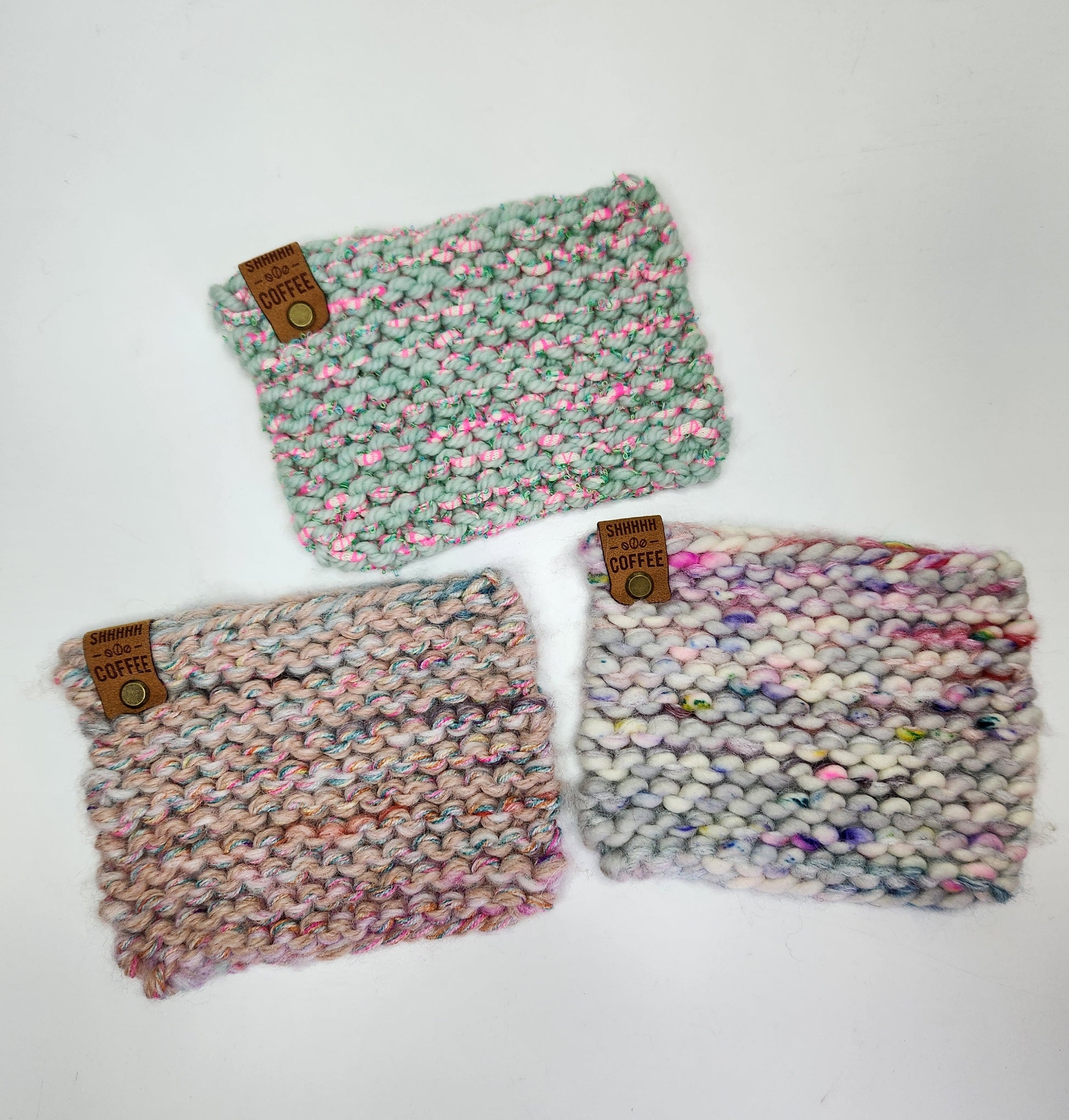 Hand made mug rugs made from yarn scraps. Made from mixed fibers. Measures approximately 5"x6".