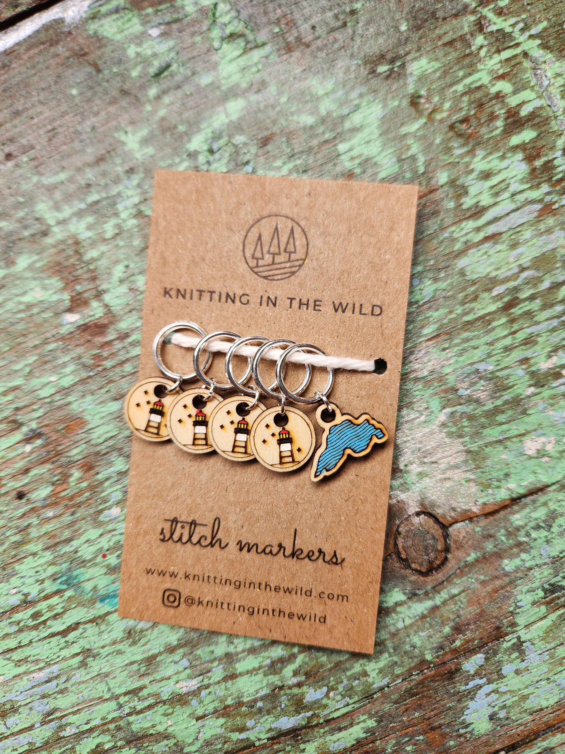 Handpainted lightweight, Grand Marais themed stitch markers, perfect for any fiber artist! Each disk marker is crafted from 1.5mm basswood and the BOR marker from 3mm basswood, making them sturdy and light. The markers are fitted with a soldered silver ring that smoothly glides over knitting needles without snagging your yarn. Choose between markers fitting needles up to US 10.5 (6.5mm) or up to US 15 (10mm).